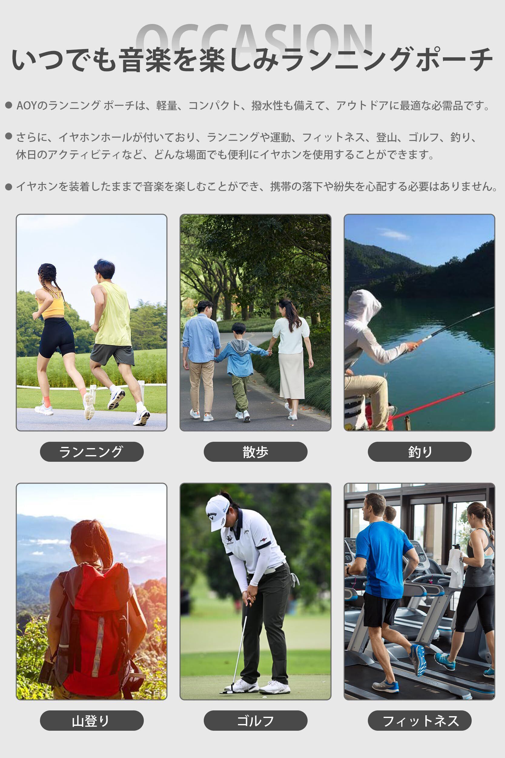 【イヤホンホール・付き設計】 AOYのランニング ポーチは、イヤホンホールが付いており、ランニングや運動、フィットネス、登山、ゴルフ、釣り、休日のアクティビティなど、どんな場面でも便利にイヤホンを使用することができます。イヤホンを装着したままで音楽を楽しむことができ、携帯の落下や紛失を心配する必要はありません。自由に動きながら快適に音楽を楽しむことができます。