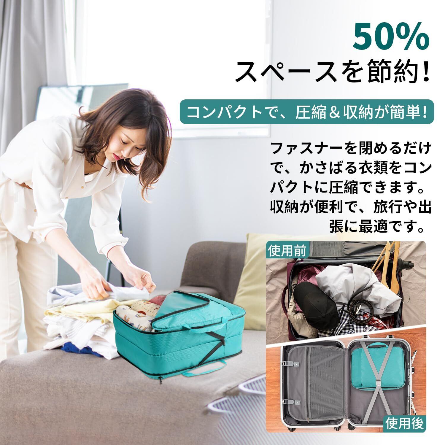 【省スペース】ファスナーのデザインで外側ファスナーを閉めるだけで圧縮し、スーツケース内のスペースを約50%節約できます。旅行用圧縮袋でより多くの衣類を収納でき、スーツケースの中を綺麗にスッキリ整理できます。安心で快適な旅行や出張を実現します。