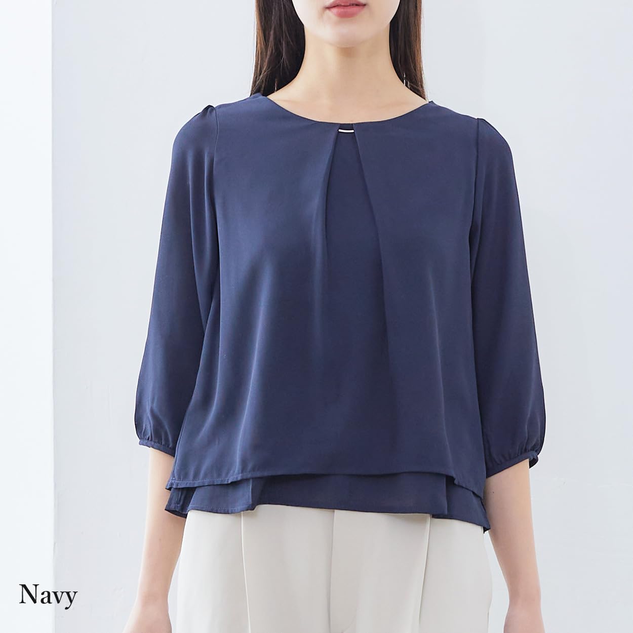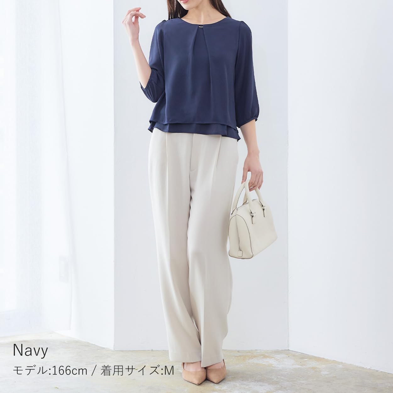 【サイズ】S、M、L、LL 【カラー】オフホワイト、ピンクホワイト、ネイビー 【素材】ポリエステル100% 【縫製】中国製 ※写真の女性は165cm(着用サイズM)