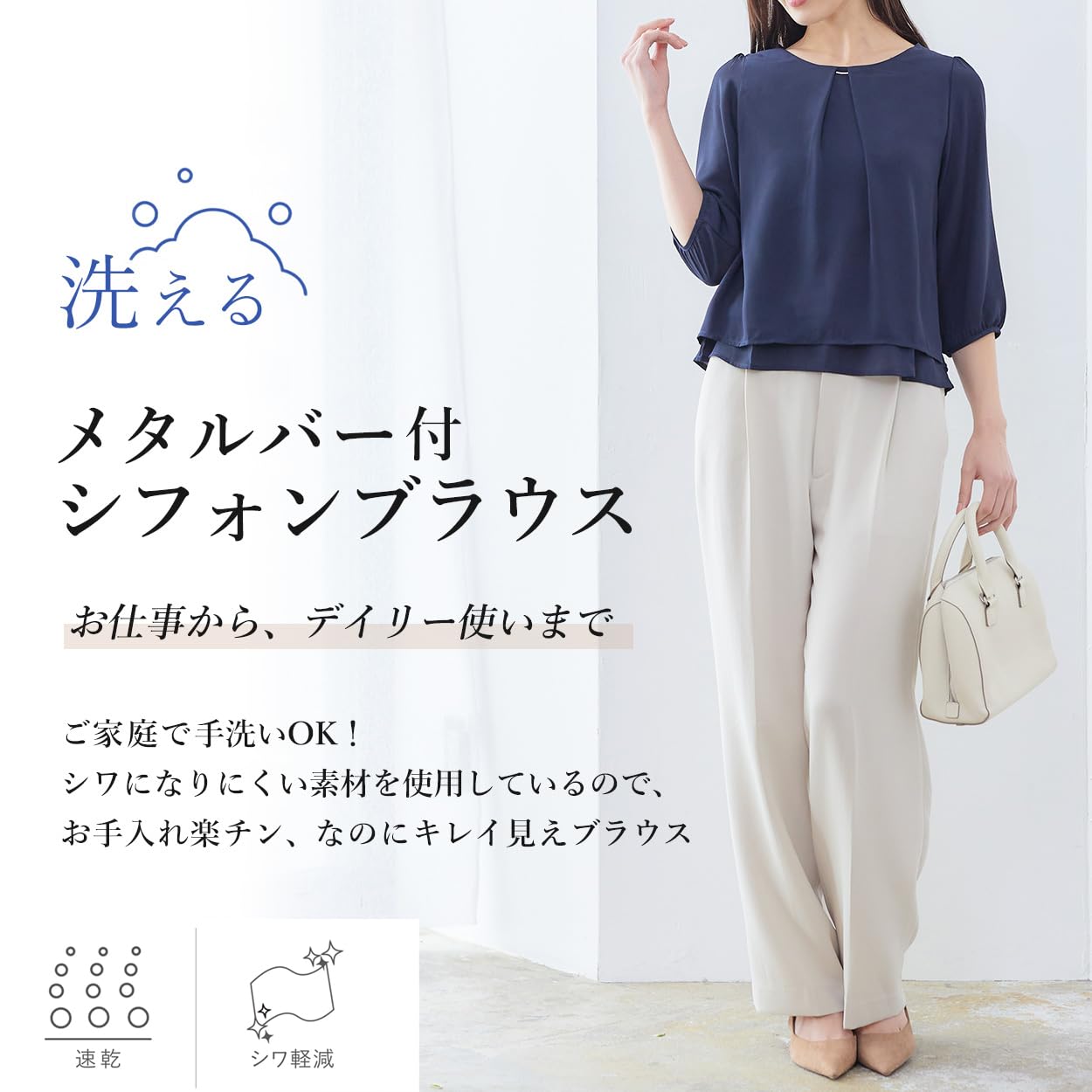 ふんわり大人フェミニン、でもしっかり機能的な欲張りブラウスが誕生しました。長時間の座り仕事や洗濯後もシワになりにくい素材を使用しているのでお家でのお手入れも簡単です。汗をかいても肌に残りにくいドライタッチな素材感で着心地サラリ。汗に強いので夏場でも快適な着心地です。