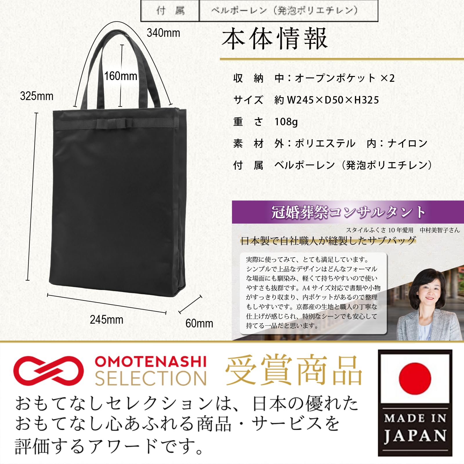 ️このバッグは、コーディネートしやすいデザインにこだわり、日本製ならではの品質で仕上げられています。結婚式や学校行事など、さまざまなシーンで活躍するサブバッグとしておすすめです。安心の撥水仕様も備え、予期せぬ天候にも対応できるので安心してご利用いただけます。