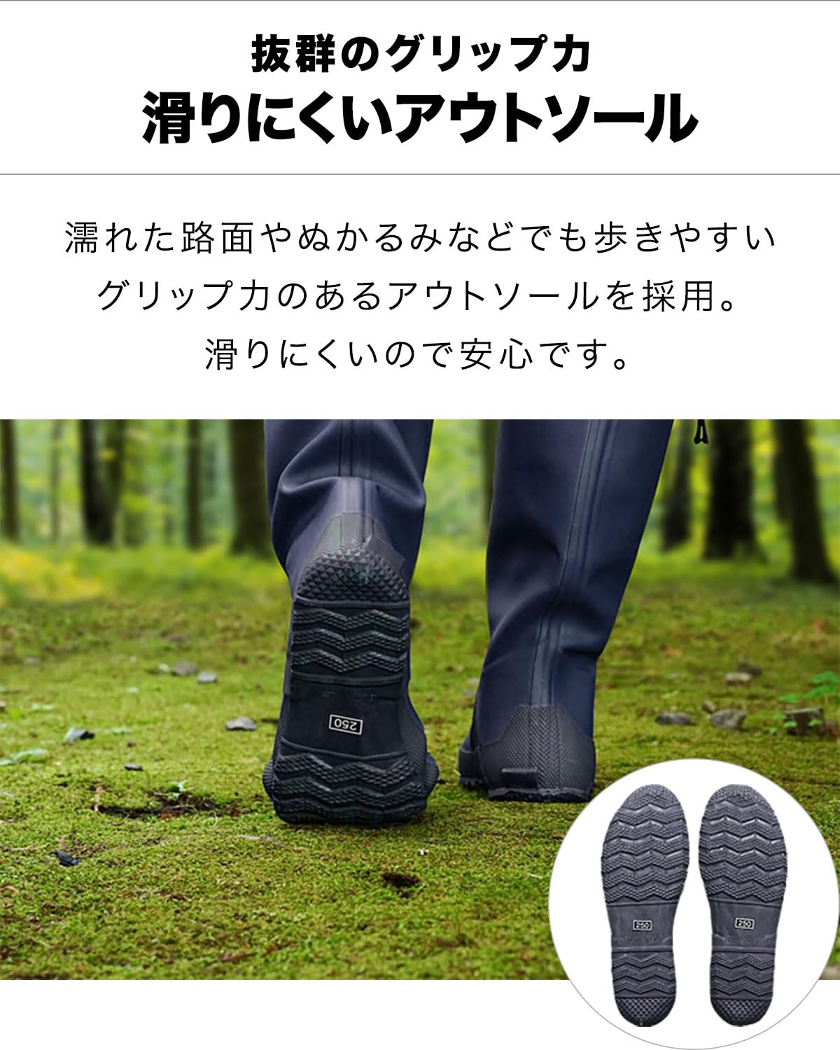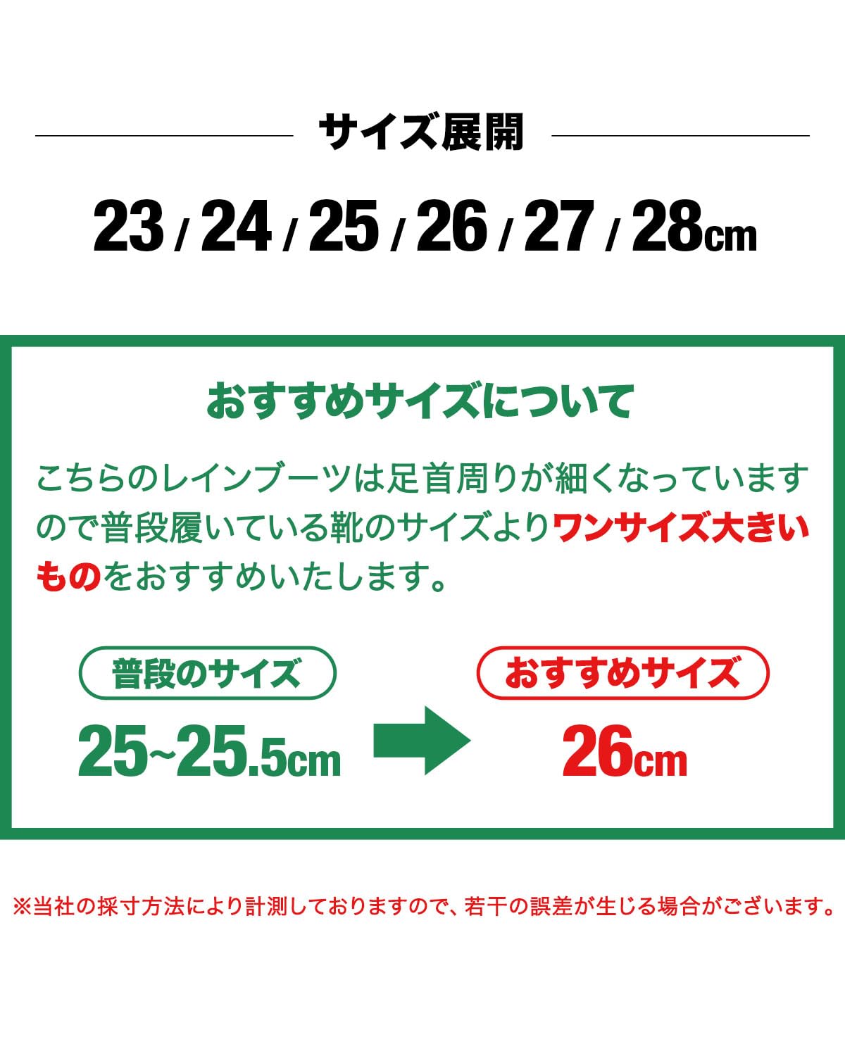 足首周りが細くなっておりますので、通常履いている靴のサイズより、ワンサイズ大きいものをおすすめ致します
