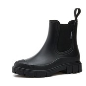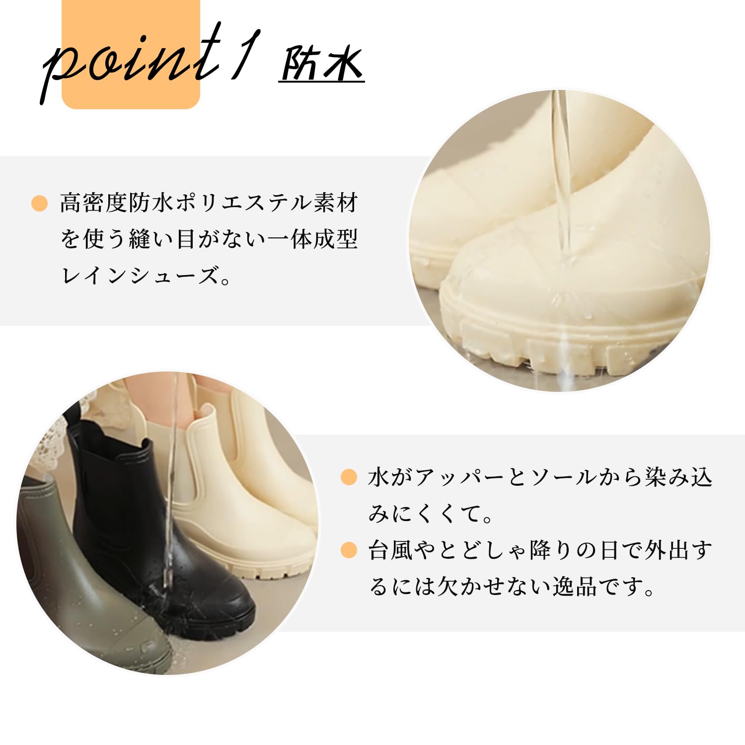 【防水】高密度防水ポリエステル素材を使う縫い目がない一体成型レインシューズ、水がアッパーとソールから染み込みにくくて、台風やとどしゃ降りの日で外出するには欠かせない逸品です。
