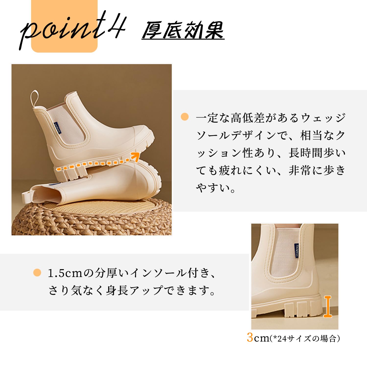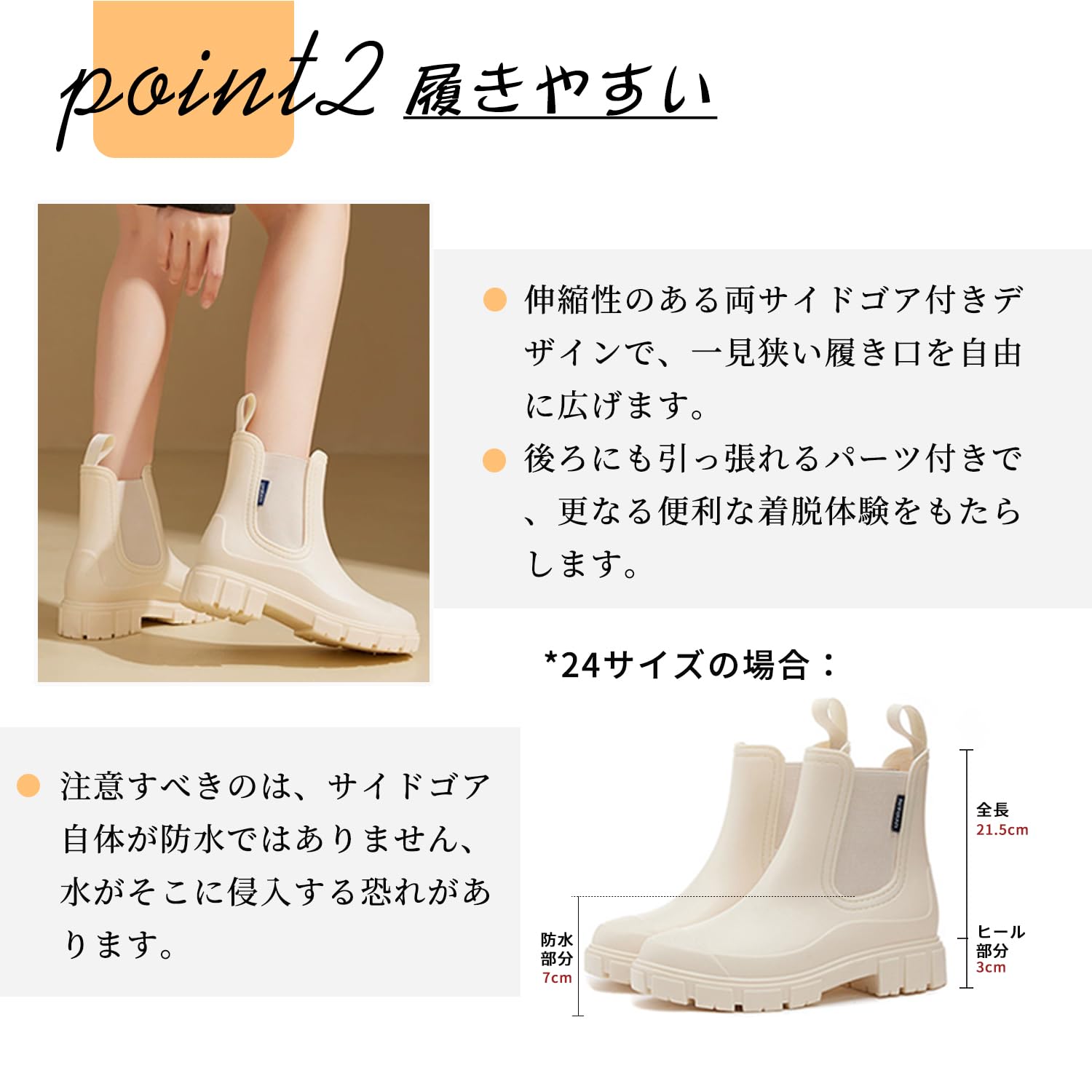 【履きやすい】伸縮性のある両サイドゴア付きデザインで、一見狭い履き口を自由に広げます。後ろにも引っ張れるパーツ付きで、更なる便利な着脱体験をもたらします。注意すべきのは、サイドゴア自体が防水ではありません、水がそこに侵入する恐れがあります。*24サイズの場合:全長:18.5cm、防水部分(地面からサイドゴアまでの高さ):7cm。