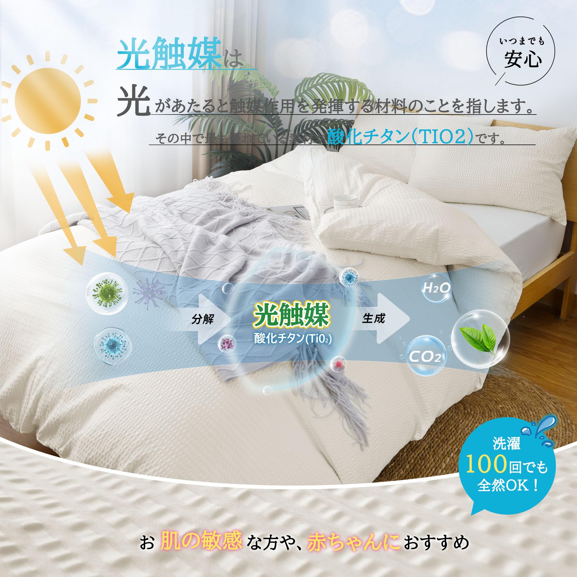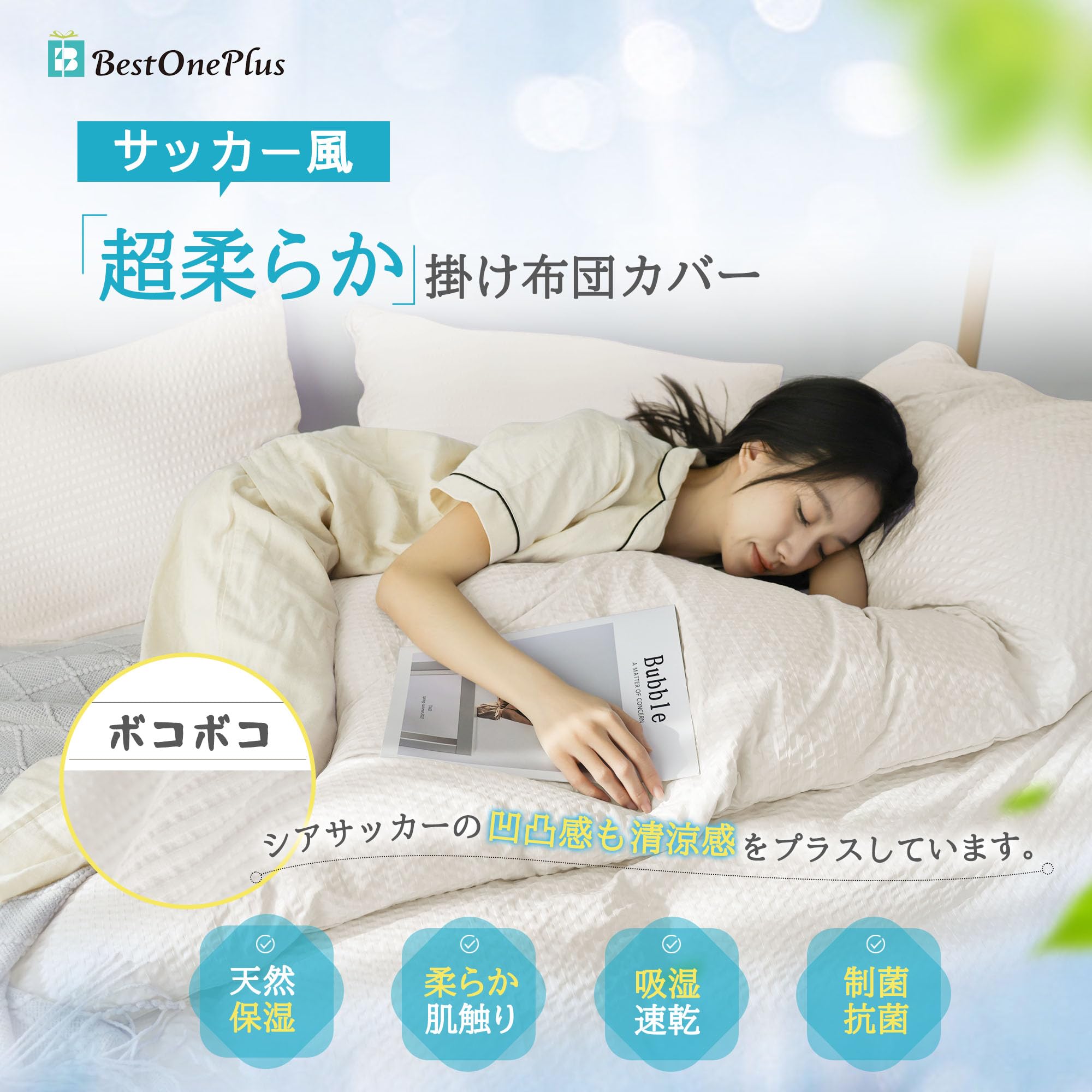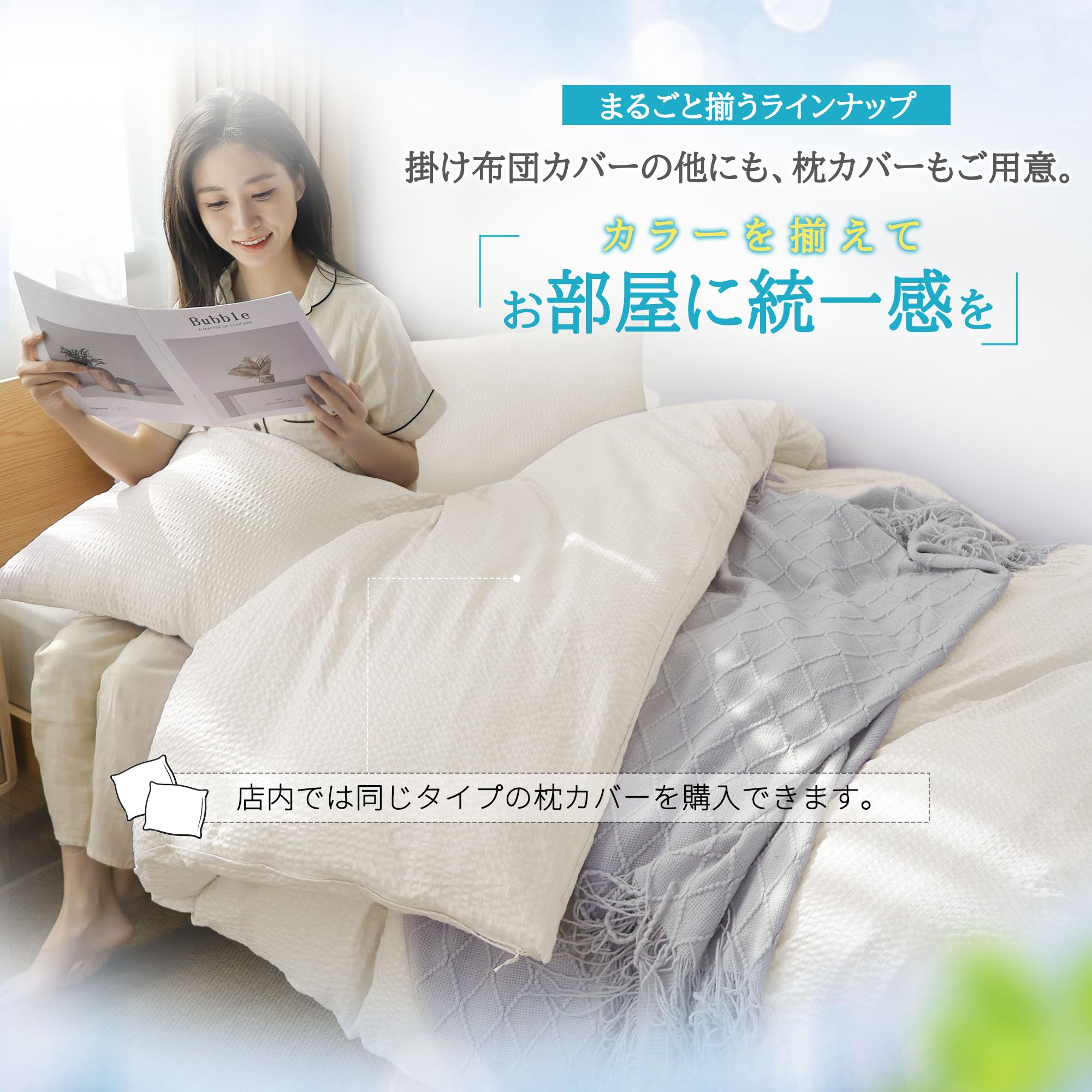 【シアサッカー風生地】掛け布団カバーはサラッとドライタッチな表面がポコポコとしたシアサッカー風の素材を使用。シアサッカーとはさらりとした感触で肌ざわりもよく、涼しくて快適な夏にオススメの素材です。くしゆくしゅしたシワ感が特徴的な凹凸感のある生地です。四季を通じて利用できます。