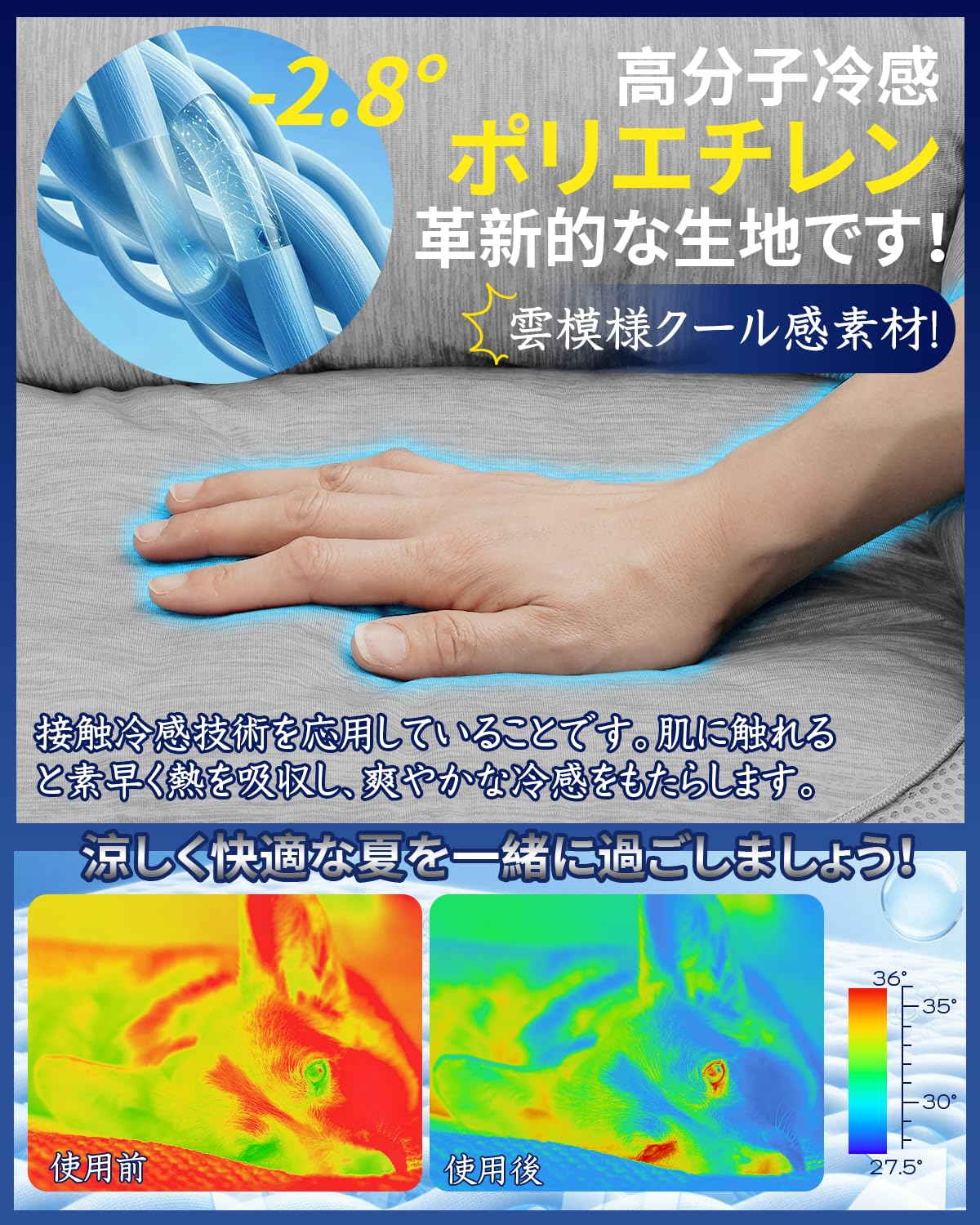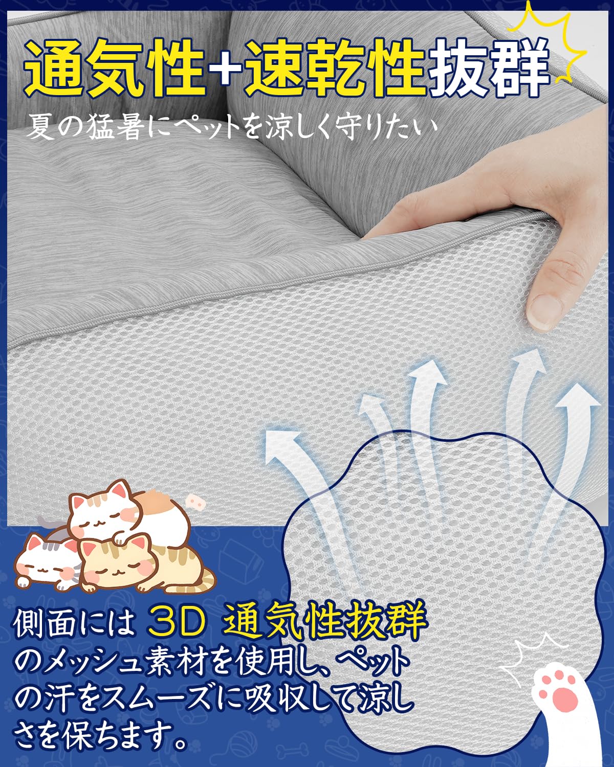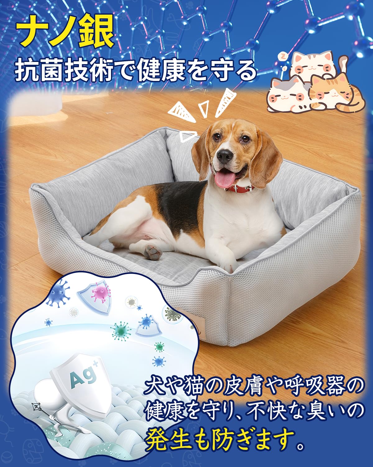 【ナノ銀抗菌技術で健康を守る】ひんやり冷感ペットベッドにナノサイズの銀粒子を利用したナノ銀抗菌技術を搭載しています。犬や猫は好奇心旺盛で、ベッドを頻繁に触れることが多いですが、この抗菌技術により、常に清潔で安心な環境を維持します。細菌やカビの細胞膜に侵入し、その活動を阻害し、繁殖を抑えることができます。これにより、犬や猫の皮膚や呼吸器の健康を守り、不快な臭いの発生も防ぎます。