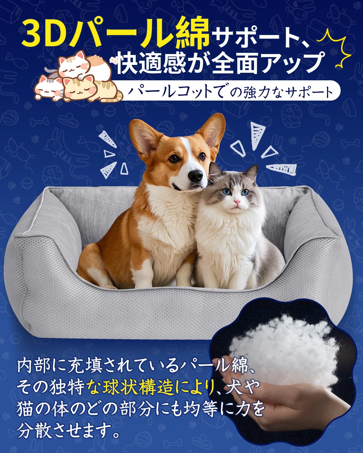 【パールコットでの強力なサポート】ひんやり冷感ペットベッド内部に充填されているパールコットは、その独特な球状構造により、犬や猫の体のどの部分にも均等に力を分散させます。犬が元気に走り回ったり、猫がぶら下がったりした後でも、立っているときには足元の疲れを和らげ、横になっているときには背中や腰をしっかりと支えます。どんな姿勢でも、犬や猫が快適に休息できるようになっています。また、このパールコットは弾力性にも優れており、長時間の使用にも耐え、形を保ち続けます。