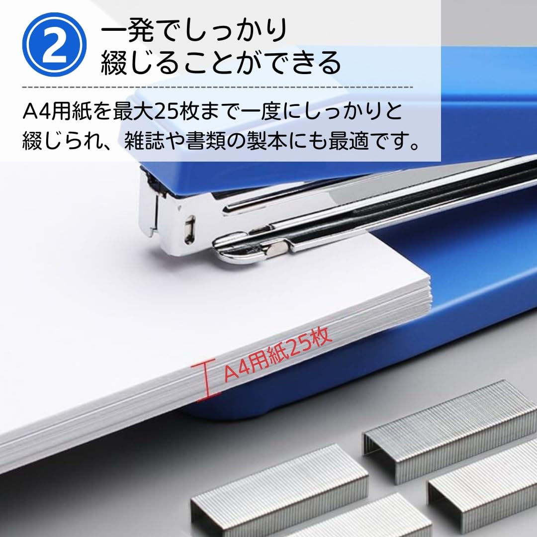 【頼れる力】最大25枚の紙をまとめて綴じることができ、どんな書類も簡単に整理できます。強力な綴じ力で、厚い資料や雑誌、パンフレットなども確実にまとめられます。