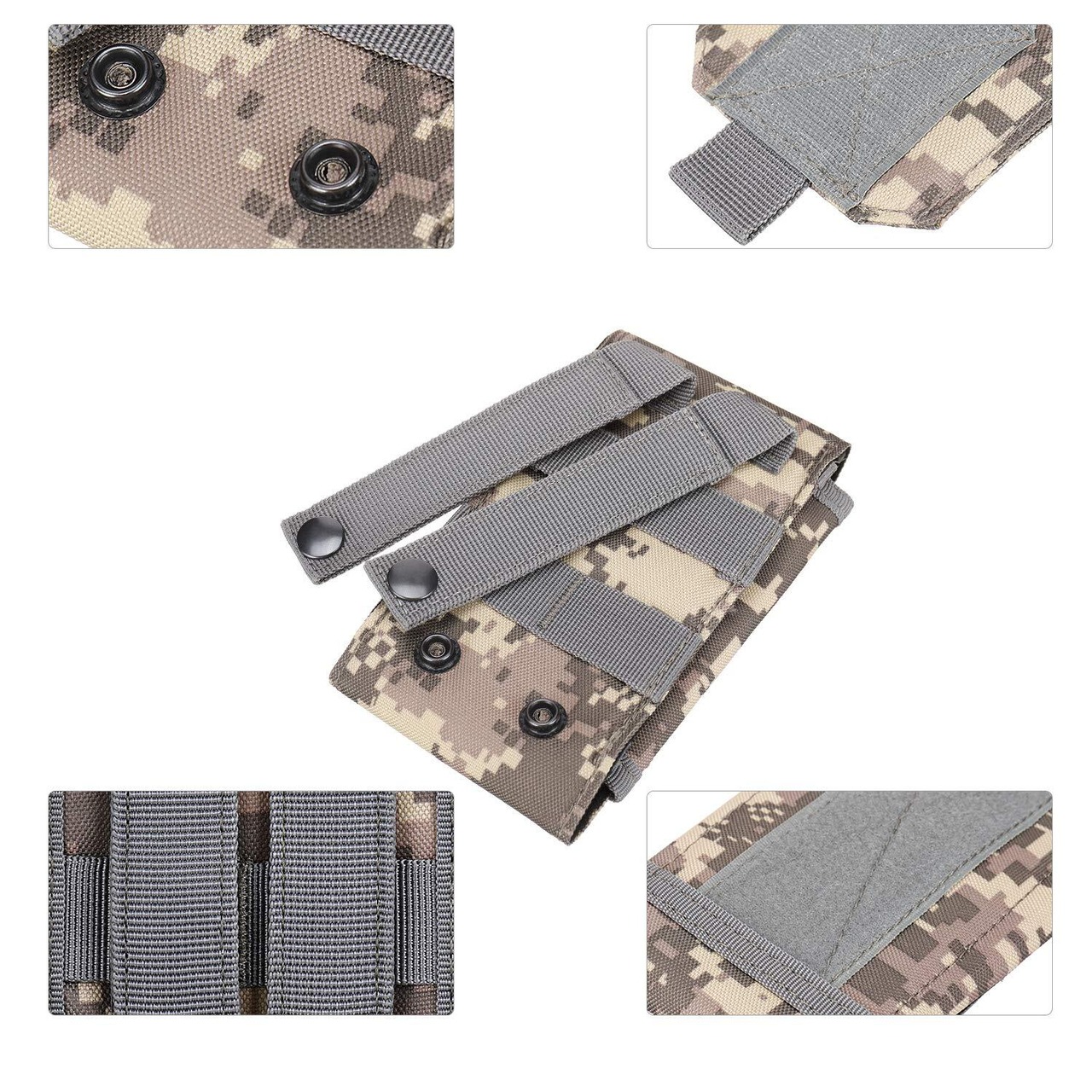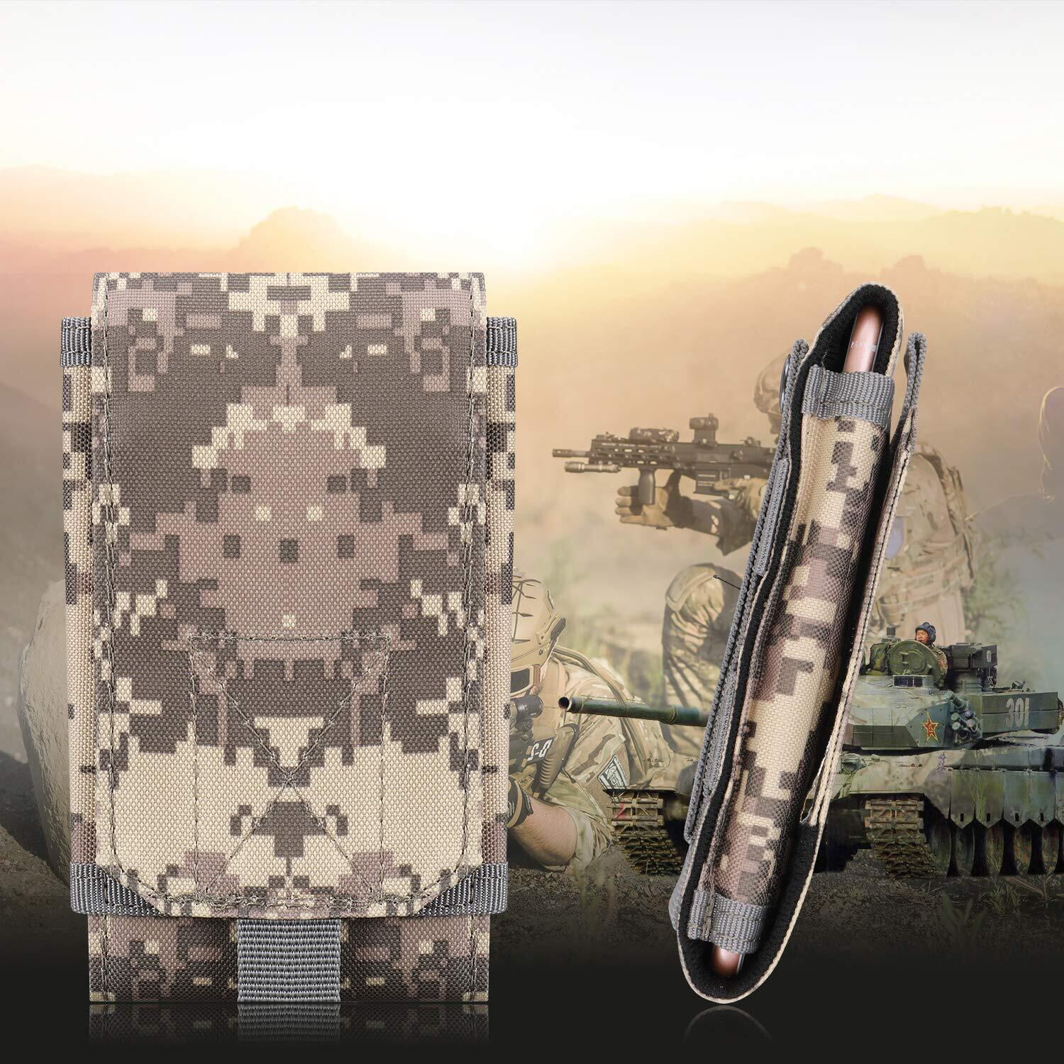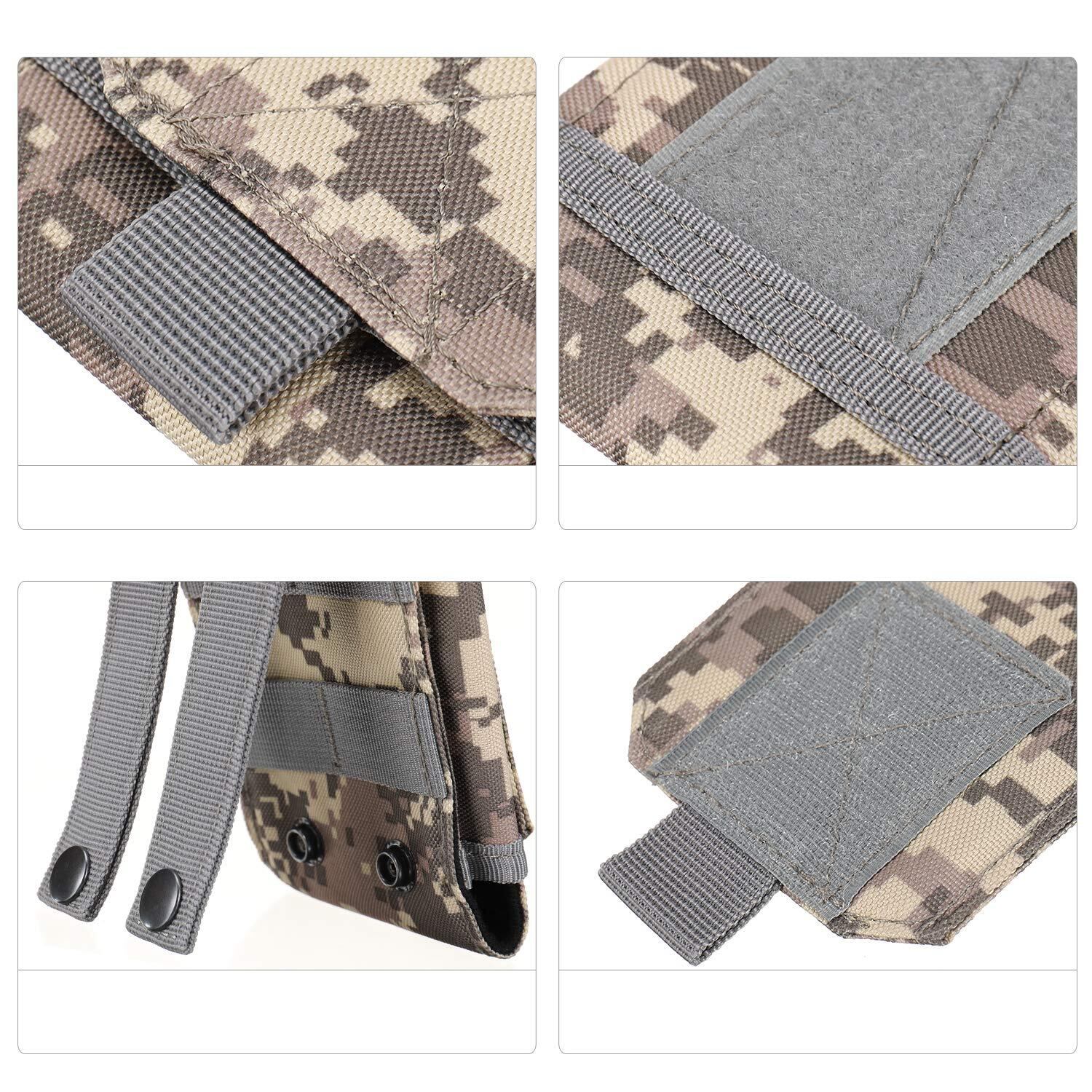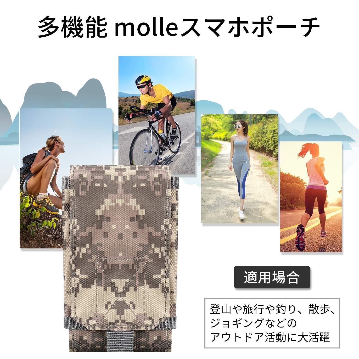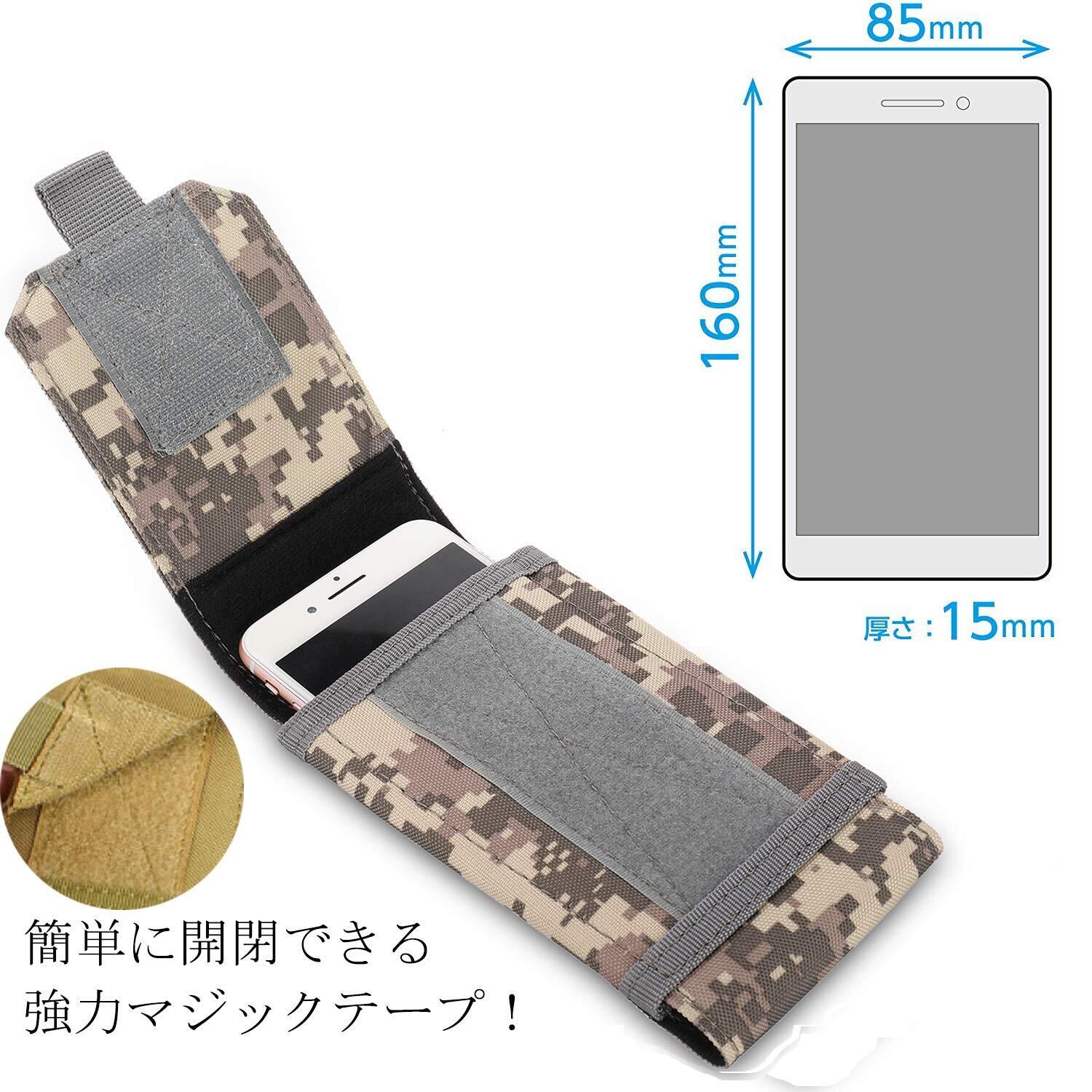 仕様:留め具は粘着的なマジックテープ仕様、サイドは伸縮性があるデザインのおかげで、ケース装着 6.0インチ以内のスマホあるいはほかのサイズ同じぐらいデジタルカメラなどの小物も何でも収納できます。背面にベルトストラップ付きで、Molleモール対応したベルト、ベストに取り付けることができます。