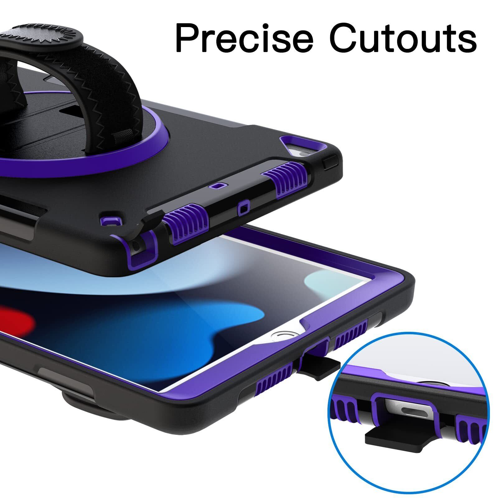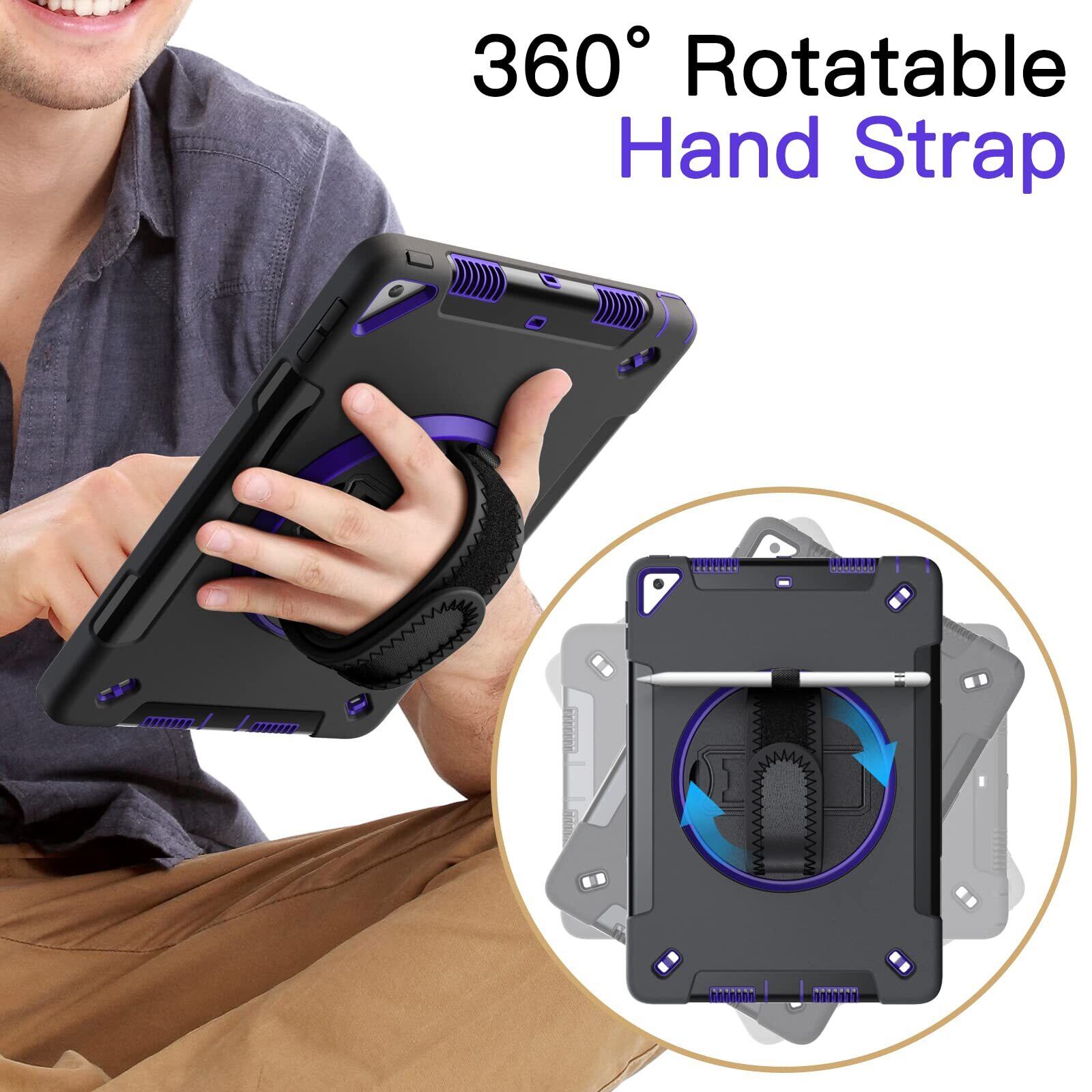 JETech iPad 10.2インチ ケース (第9/8/7世代、2021/2020/2019モデル) 液晶保護フィルム付き 保護耐衝撃頑丈なタブレットカバー 360°回転ハンドストラップスタンド (パープル)