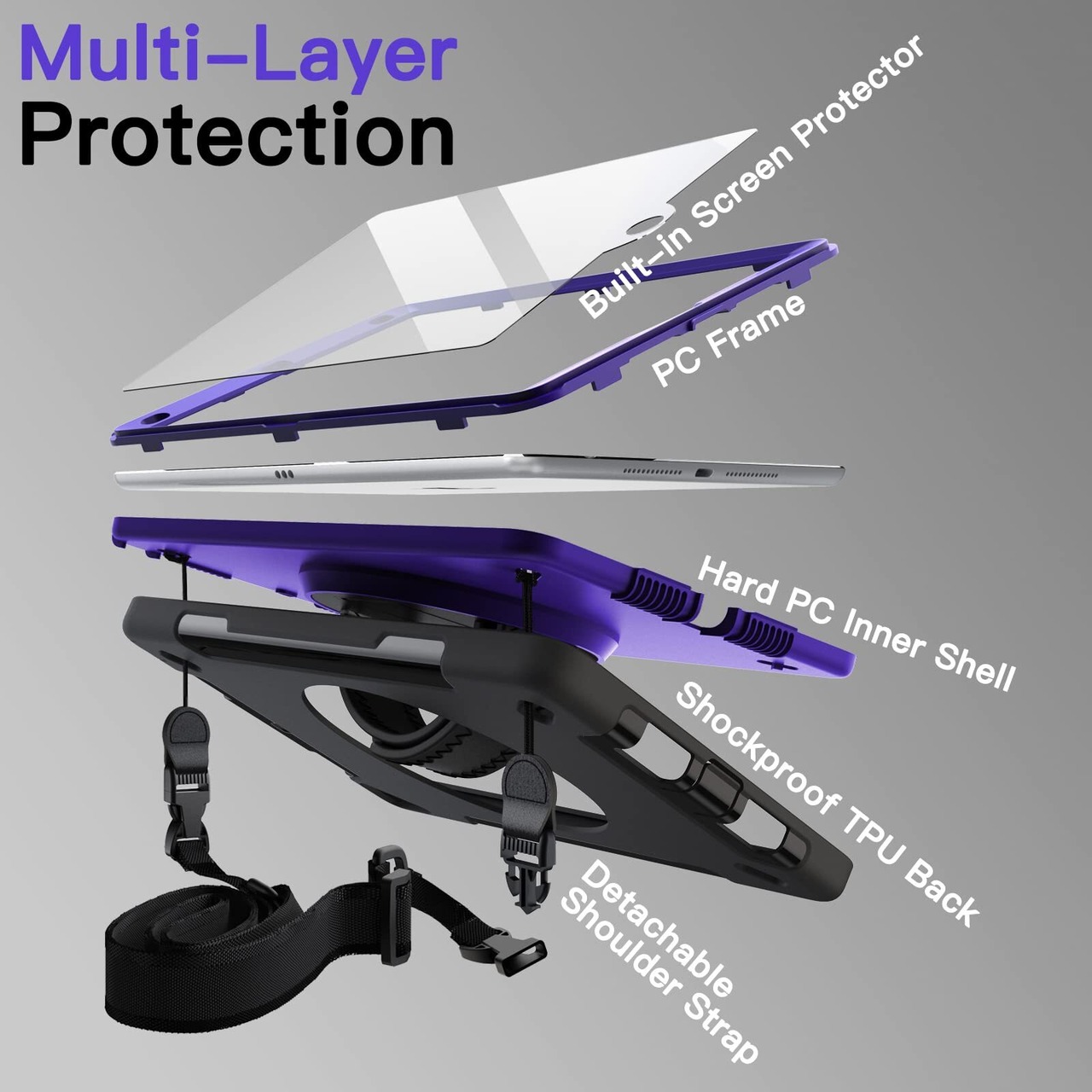 [着脱式 & 調節可能なショルダーストラップ] 自宅、職場、旅行先のどこにでも iPadを便利に持ち運べます。車のシートのヘッドレストの後ろに掛けて、共有して視聴することもできます