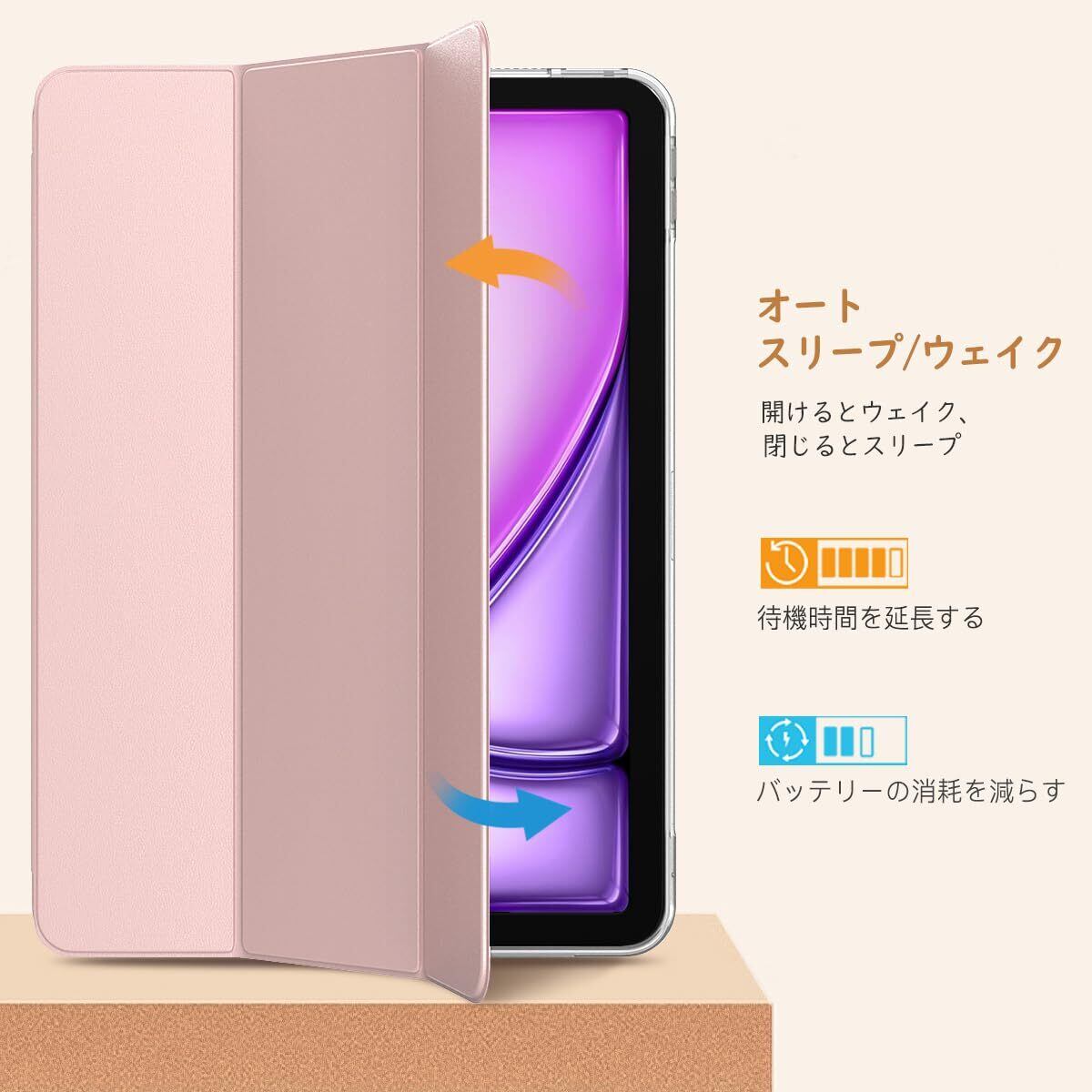 TiMOVO iPad Air 11インチ ケース M3/M2 第7/6世代 (2025/2024) iPad air 第5/4世代 ケース 10.9インチ iPadAir7/6/5/4 カバー 11インチ/10.9インチ TPU オートスリープ機能 全面保護 PUレーザー 三つ折り スタンド 着脱簡単 手帳型 半透明 ピンクゴールド