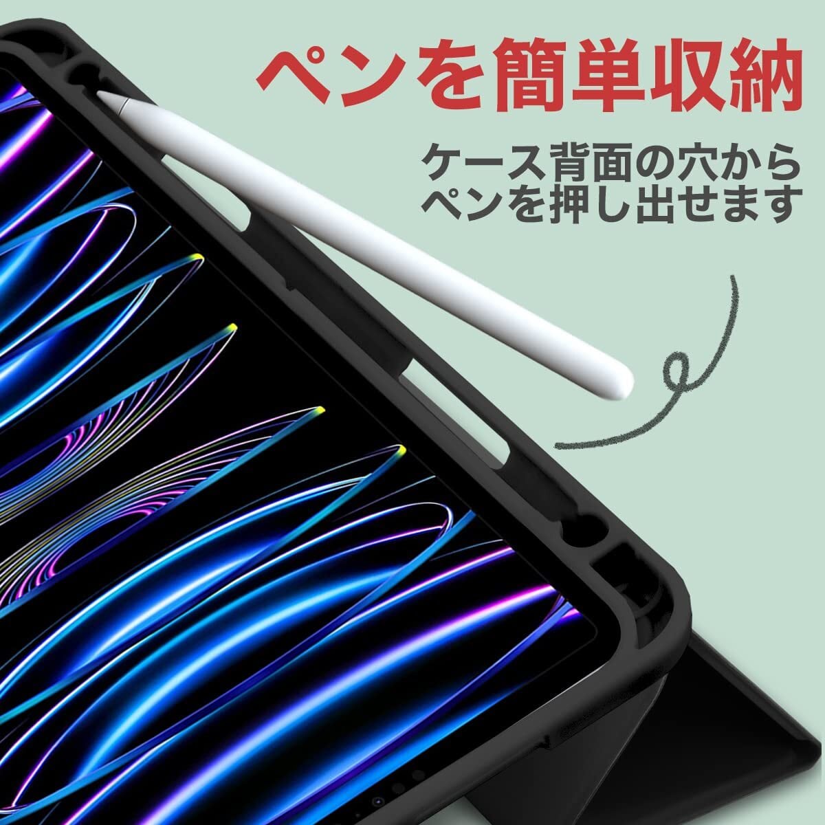 <便利なペンホルダー>◆Apple Pencil ホルダー が付いていますので アップルペンシル の紛失を防止して、安心して持ち運ぶ事ができます。(Apple Pencil ワイヤレス充電 はペンシルホルダーから取り出して反対側で充電可能です。)◆ペンシル取り出し用の穴があるので簡単にペンを取り出す事ができます。( Apple Pencil 以外でも クリップが付いていない 直径9mm程度のスタイラスペンの収納も可能です。クリップが付いていた場合、フタが閉まらなくなるのでご注意ください。)