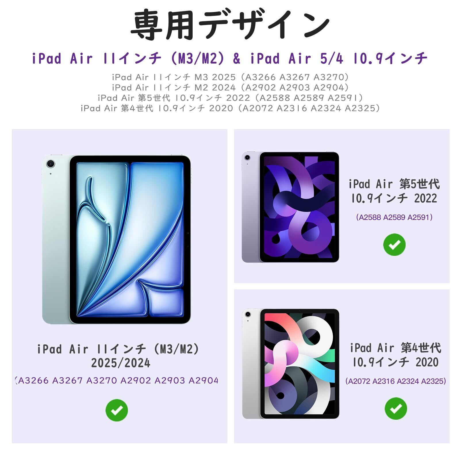 「対応機種」2025年発売のiPad Air 11インチ(M3)(モデル番号:A3266、A3267、A3270)、2024年発売のiPad Air 11インチ(M2)(モデル番号:A2902、A2903、A2904)、2022年発売のiPad Air 5(モデル番号:A2591、A2588、A2589)と2020年発売のiPad Air 4(モデル番号:A2316、A2324、A2325、A2072)に適用します。iPad(A16)第11世代 11インチ、iPad 第10世代 10.9インチ、iPad Air 13インチ、又は他のモデルには適用しません。ご購入前に、機種・モデル番号をご確認ください。ご注意:モデル番号の確認は端末本体の背面カバーにチェックしてください。