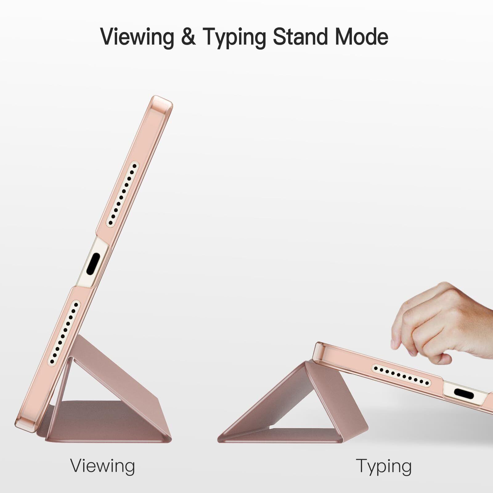 マグネット内蔵、オートスリープとオートウェイクアップ機能が付きます。三つ折りフロントカバーにより、視聴とタイピングに合わせた2つスタンド角度を調整できます