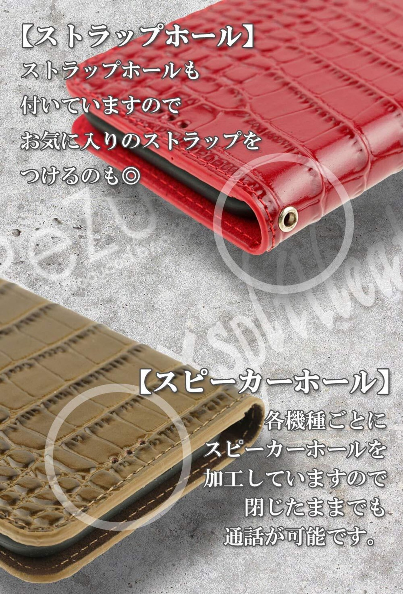 軽量かつ強度のあるTPUとワニ皮調の型押し加工された良質なスプリットレザーのシンプルなデザインのケースです。また蓋にマグネットを使用していませんので磁気系カードも安心してカードホルダーに収納できます