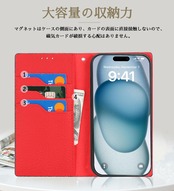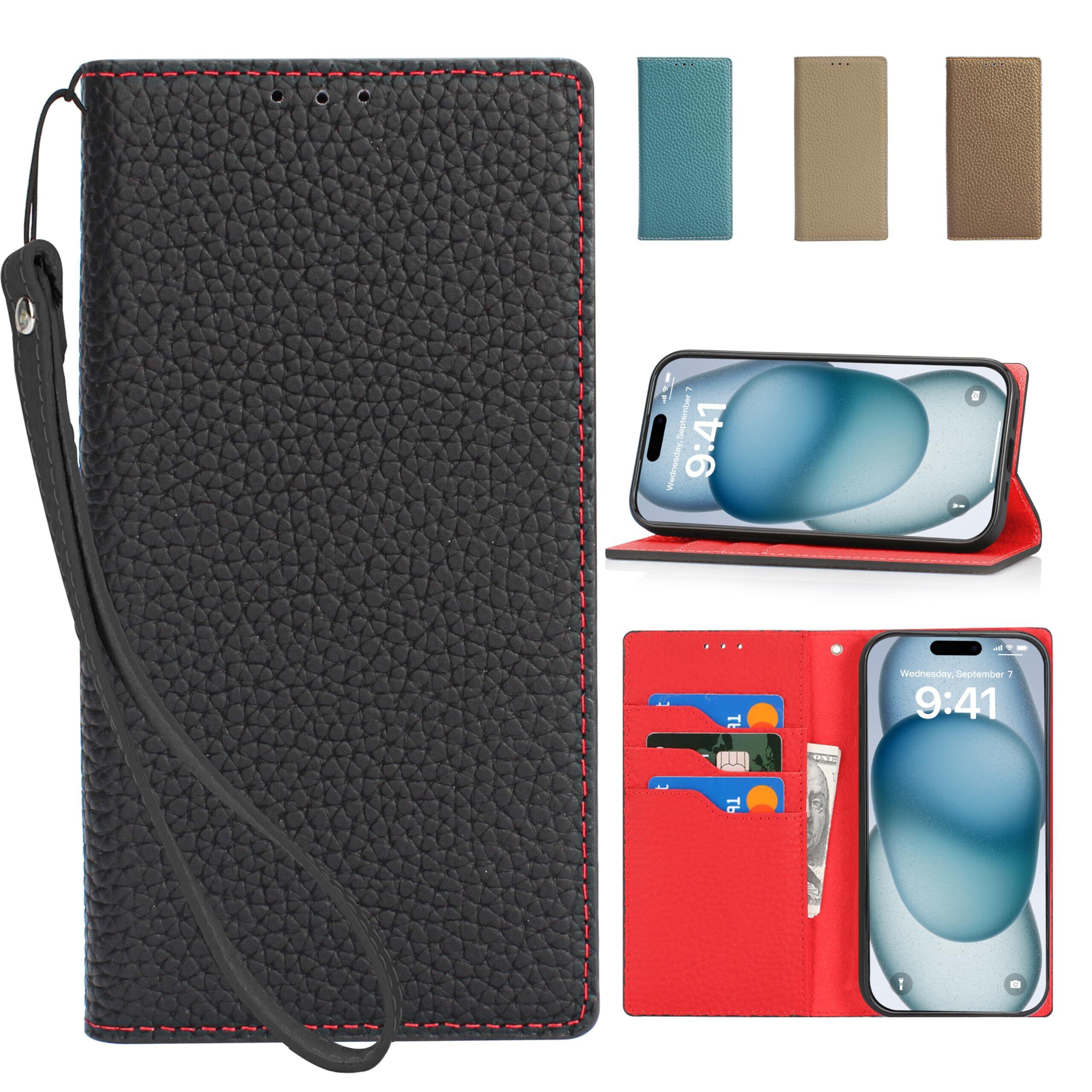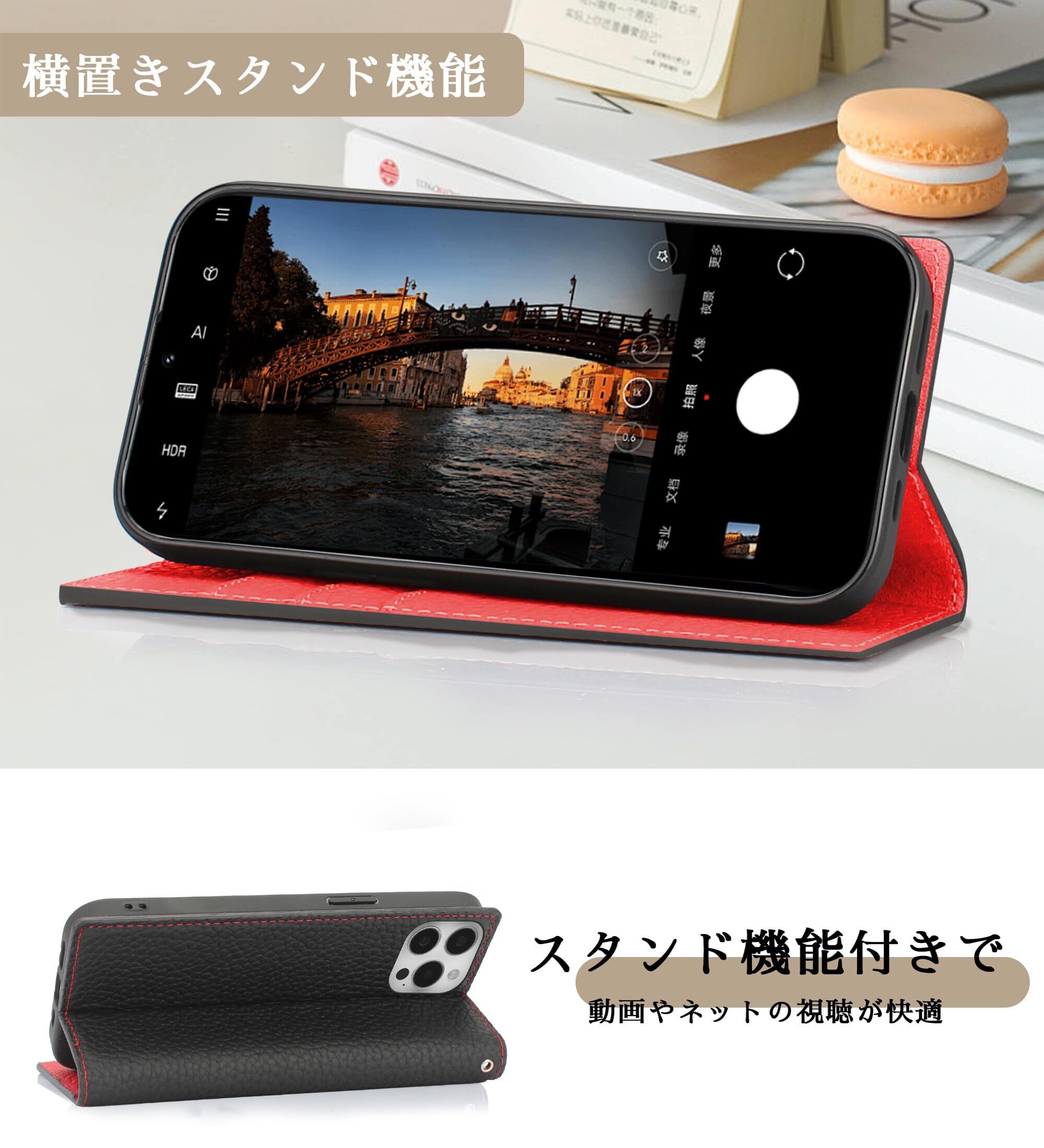 CLICSUN iPhone15Pro 対応ケース 高級牛本革ケース 手帳型 アイフォン15 Pro 対応 カバー 本革 レザー いPhone 15 Pro カバー スタンド機能 ストラップ付き マグネット式 カードポケット ブラック×レッド