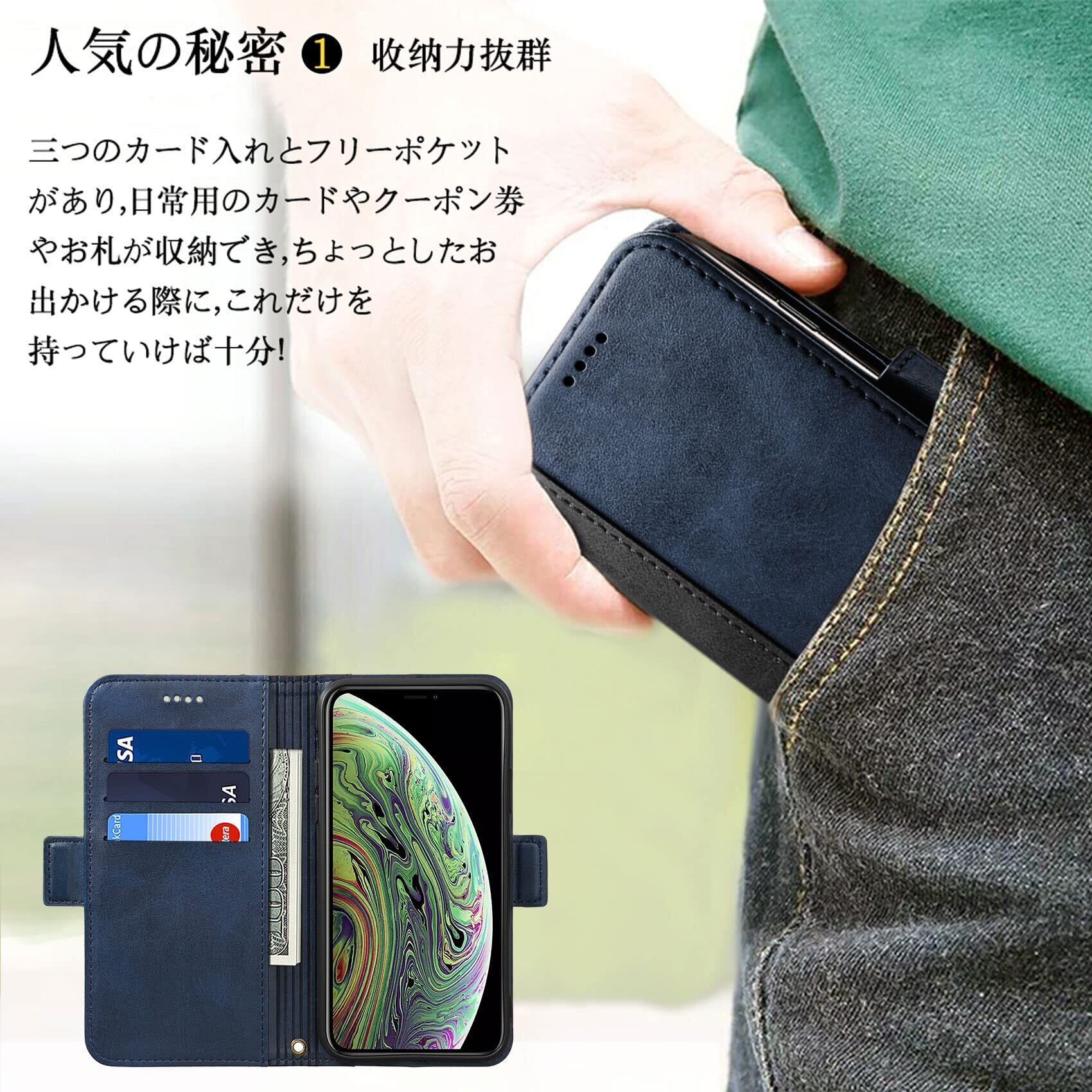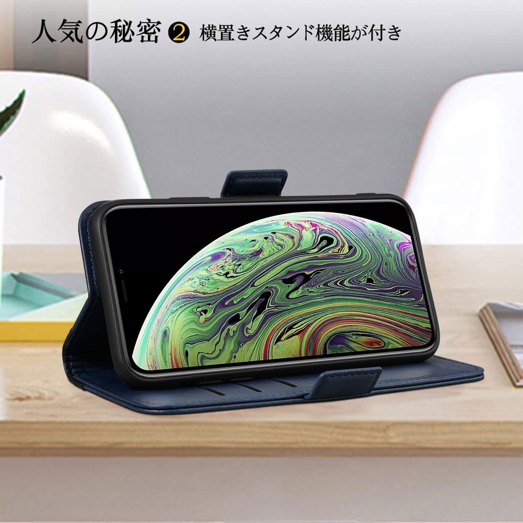 機能性 横置きスタンド機能が付いて、好きな角度で動画鑑賞や読書などを楽しめます。ブック型ケースとして、内側には三つのカード入れとフリーポケットがつき、名刺や定期券の収納に優れているiPhoneX、Xsケースです。