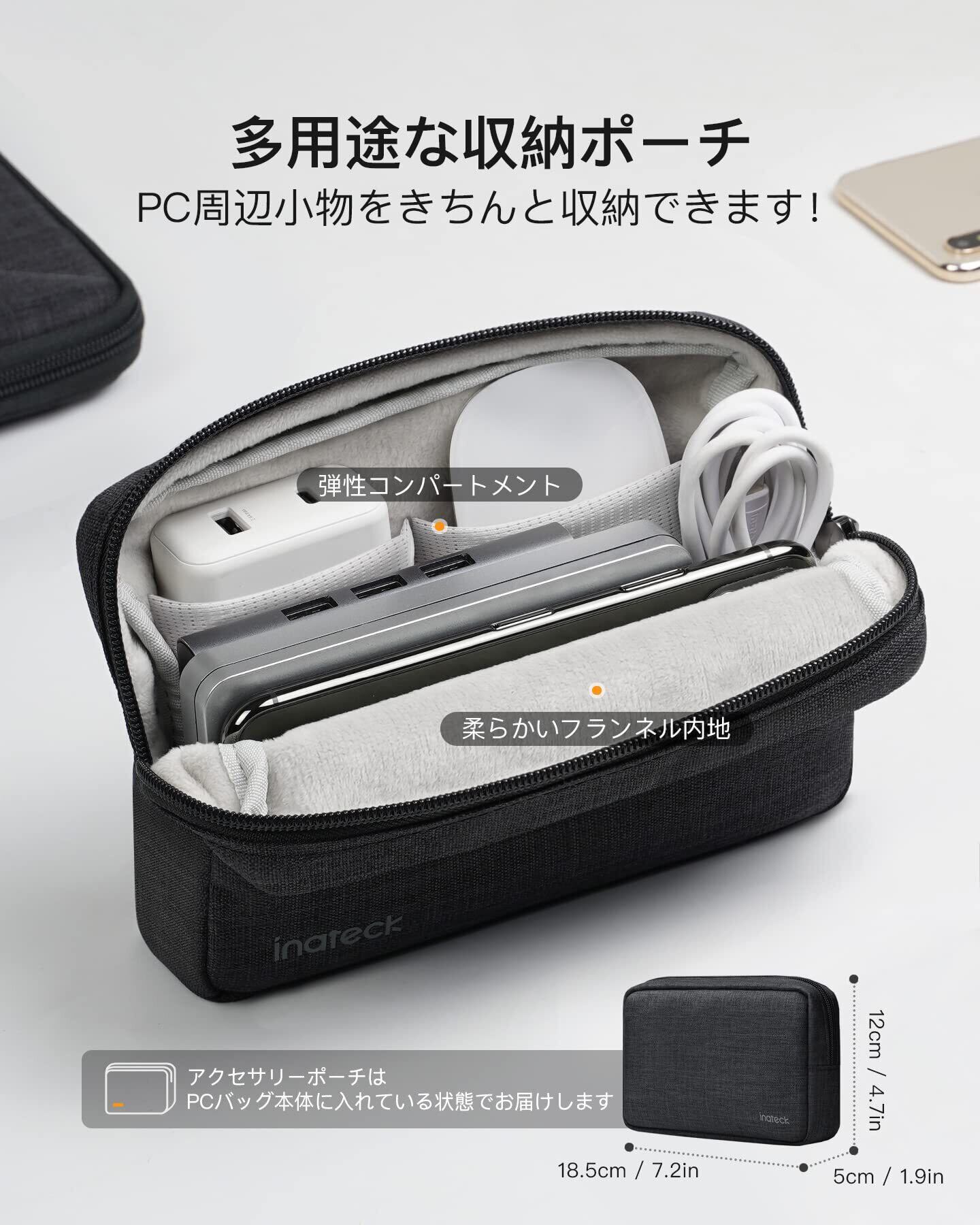 細部までこだわり:頑丈なデュアルジッパーと大きなジッパー開口部はだしいれしやすくて、滑らかで耐久性があります。付属のポーチは、マウス、充電器、またはヘッドフォンを収納できます。内部の伸縮性ある生地でラップトップを安定に収納することができます。