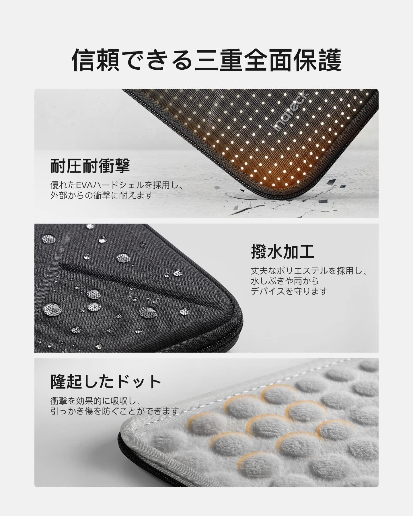 3層保護:LB01007-13Sは主体がEVAハードシェルを採用し、外部からの衝撃に耐えます。内側が隆起したドットを備えた伸縮性のあるライニング生地を使って、衝撃を効果的に吸収し、引っかき傷を防ぐことができます。撥水加工ポリエステル表面は、多少の雨などでも気にせずに利用できます。