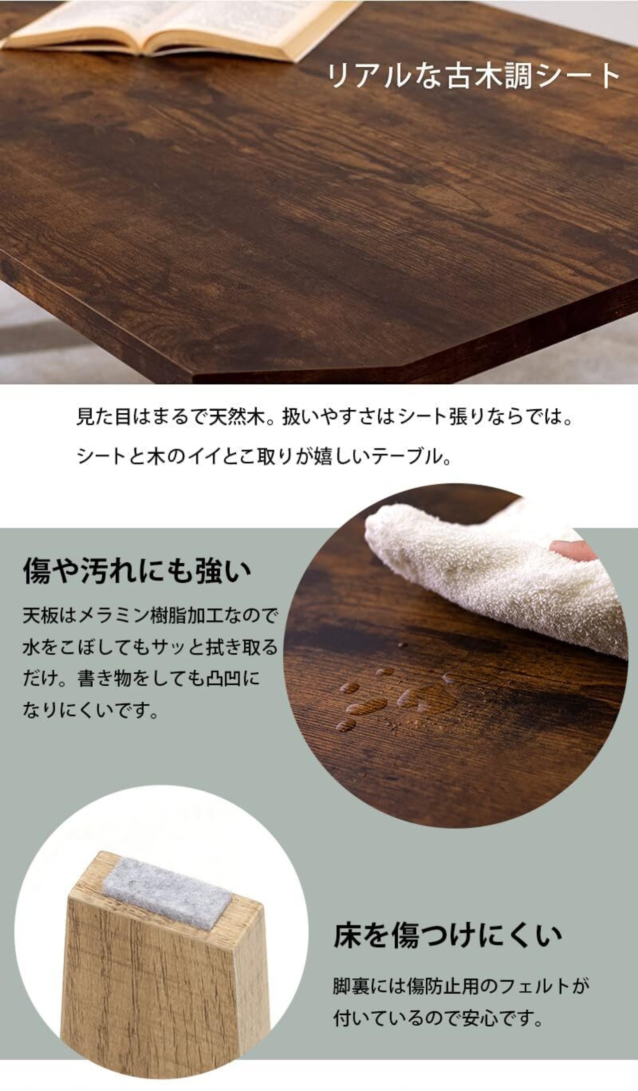 【ヴィンテージ感のある木目調ローテーブル】:リアルな古木調シートを天板に使用し、見た目はまるで天然木のように仕上げました。シートなので耐水性はバツグン。サッとふき取り、お手入れ簡単です。