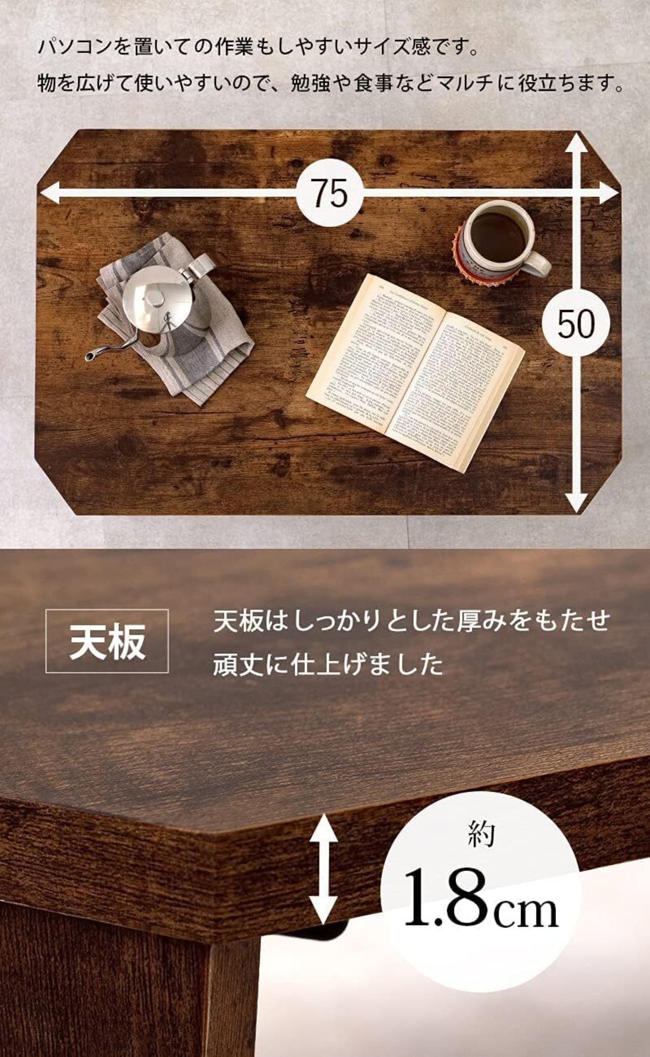 【幅75×奥行50のコンパクトサイズ】:省スぺースながらパソコンを置いての作業もしやすいサイズ感。勉強用・食卓・テレワークなど、マルチに役立ちます。