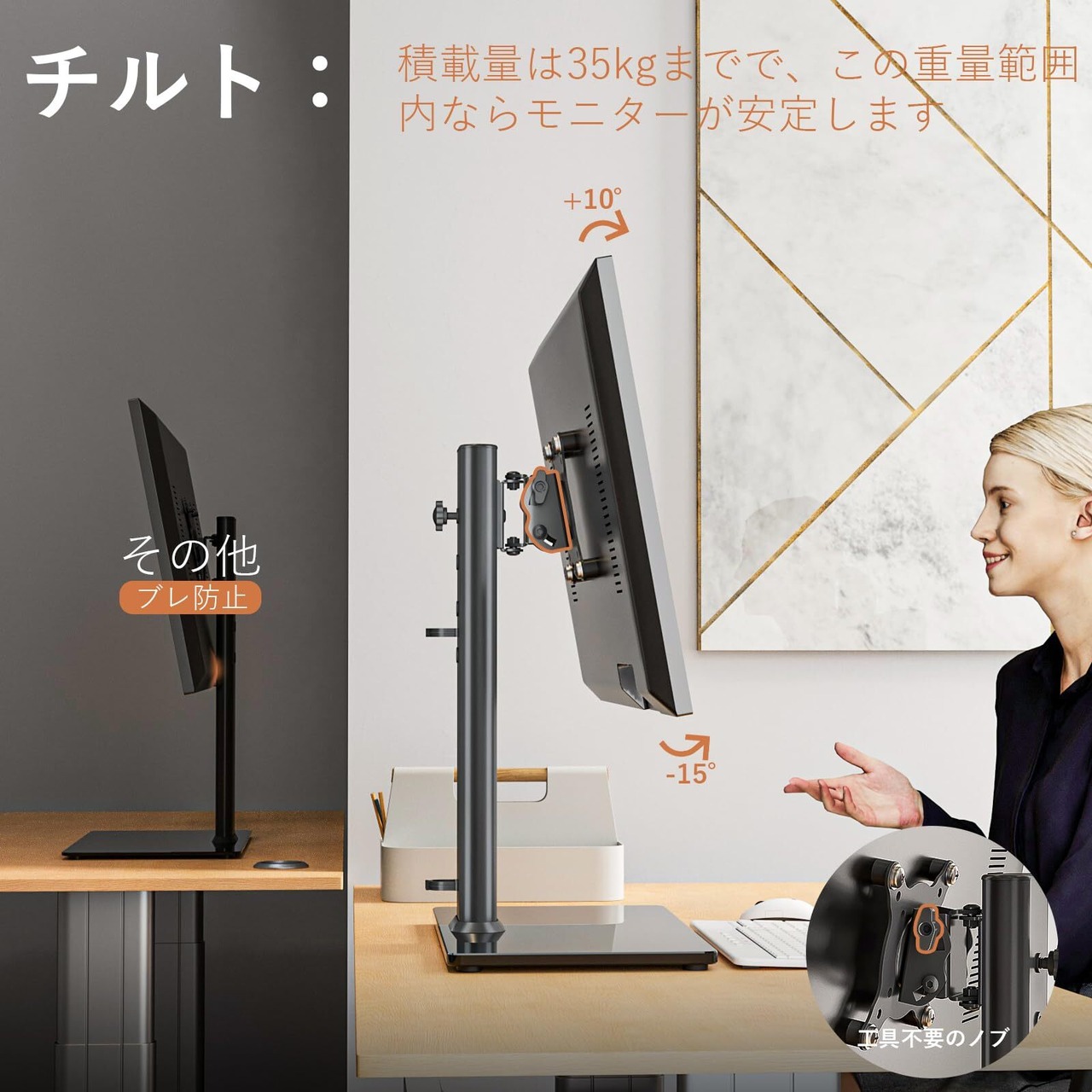 機能設計調整可能なブラケットはセンターチューブに沿って-15°から+ 10°の傾き、-50°から+ 50°の回転、360°の回転、そして4つのレベルの高さ調整を提供します。 モニターは縦向きまたは横向きに配置できます