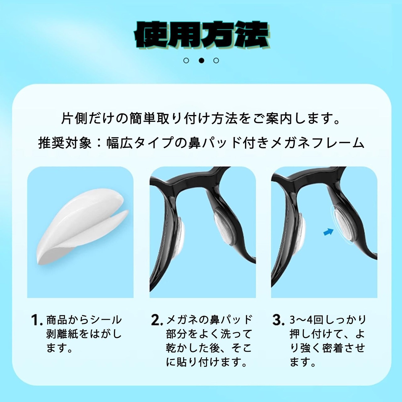 【使いやすさ】メガネ ずれ落ち防止はシール式設計で、接着剤不要。剥がして貼るだけ。貼り付け前にノーズパッドの油汚れを拭き取れば、フレーム材質を傷めず簡単に使用可能。