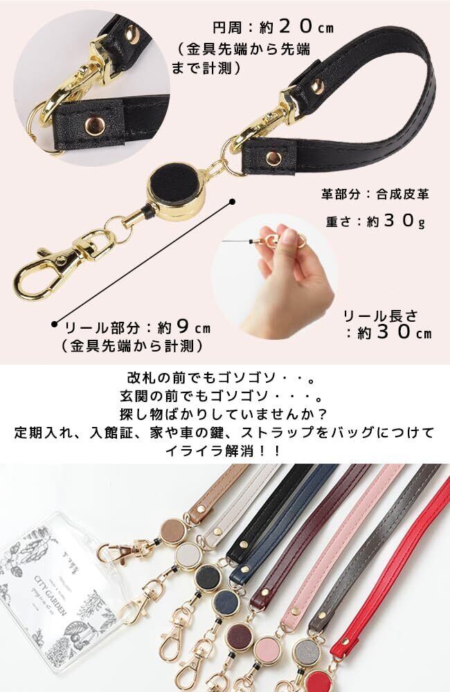 【サイズ】 リール部分約9cm、ストラップ部分約20cm、リール長さ約30cm 【重さ】 約30g、【素材】合成皮革