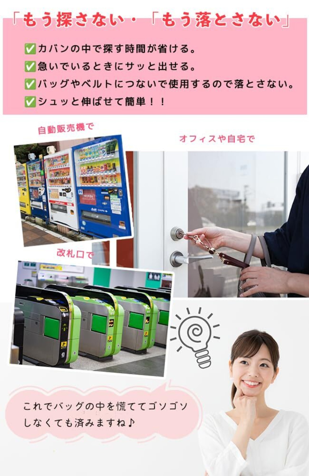 【ほしい物がサッと取り出せる】外出時、バッグの中の鍵やICカード等の小物類は小さいのでバッグの中で迷子になりがちですが、リールキーホルダーに取りつけして使用すると探す手間もなくなります。 定期入れはバッグに付けてぶら下げておいたり、30cm程度のびるリールに付けて取り出しやすいポケットに入れておけばカバンに付けたまま改札をサッと通過できます。 カギはカラビナと組み合わせてベルトループに付ければ無くすこともありませんし、玄関前でカバンの中を探すこともなくなります。