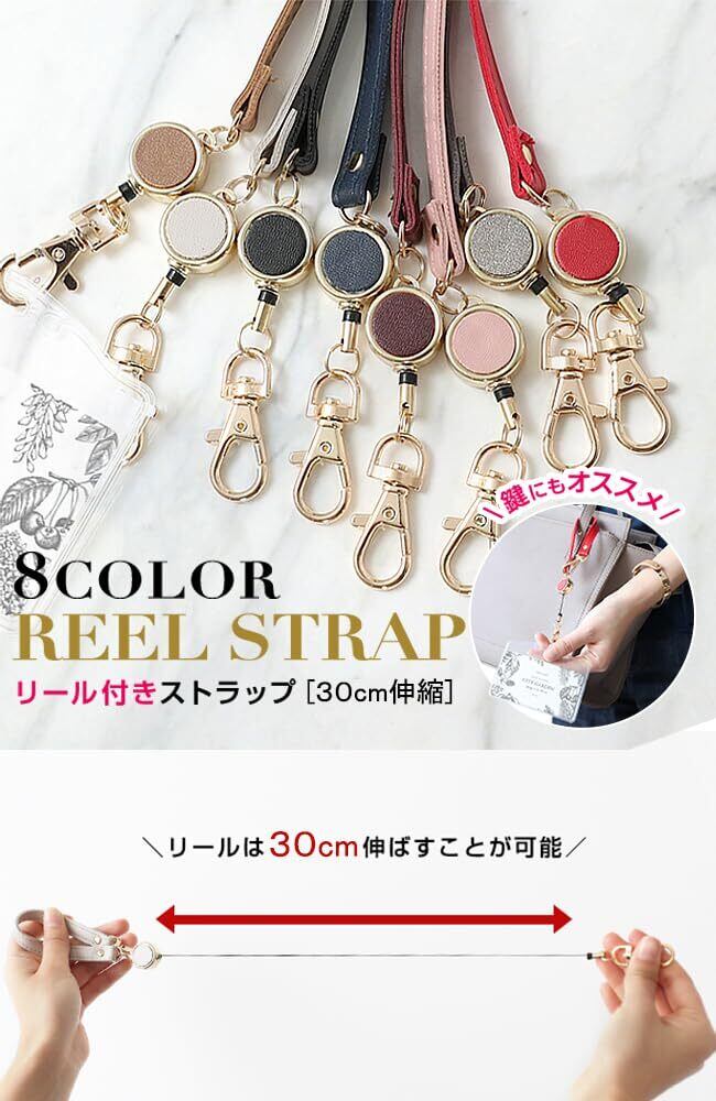 【ストレス軽減!】「カバンの中で定期入れが見つからず改札の前でモタついてしまう…」「家のカギがカバンの中で迷子になり玄関前でゴソゴソ…」等、外出時のちょっとしたしたストレスもこれで解消! リールの長さが30cm伸びるリールストラップです。