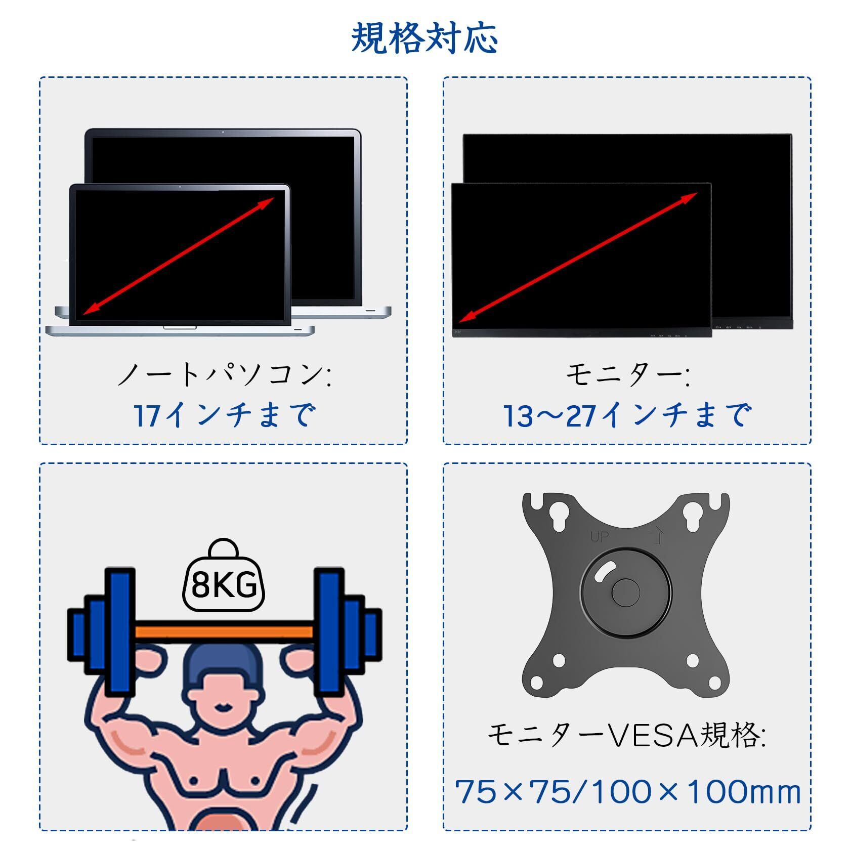 対応ノートパソコン:17インチまでのノートパソコンに対応できるモニターアームです。VESA規格:75mm x 75mm、100mm x 100mm、耐荷重は2-8kgです。