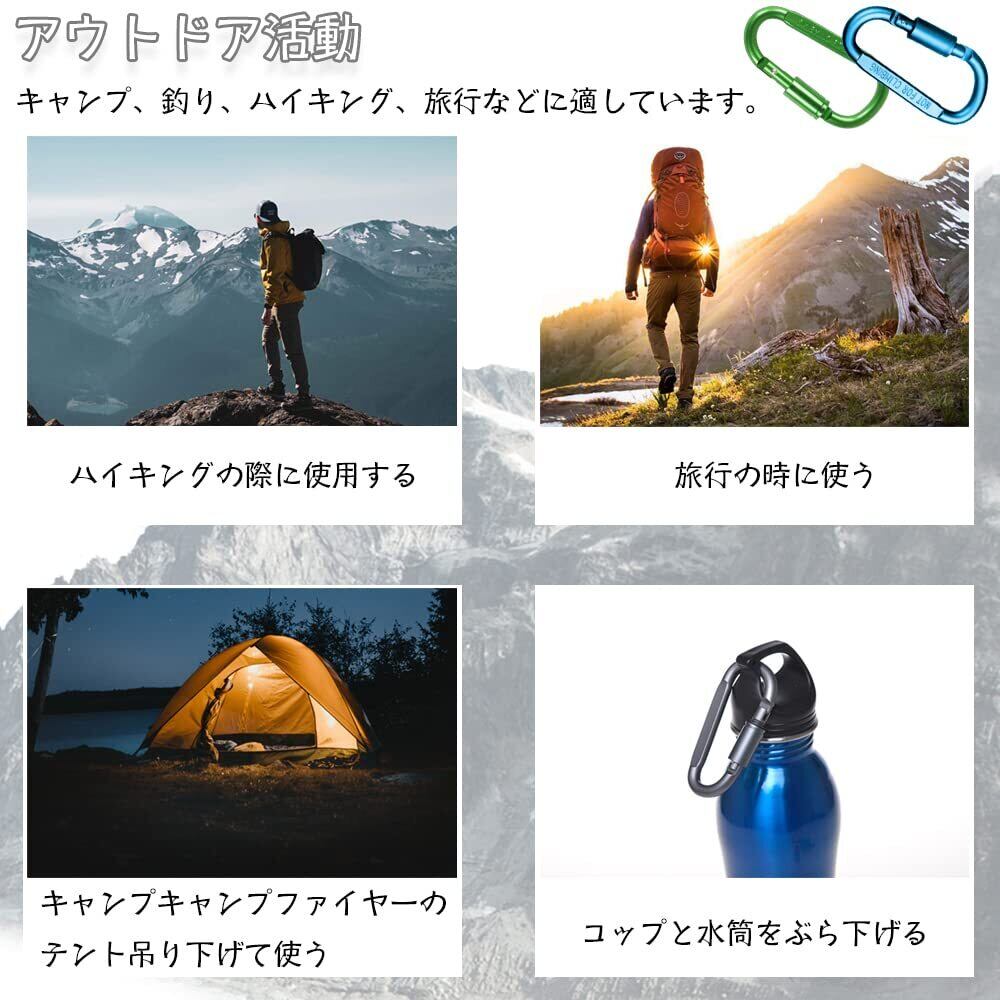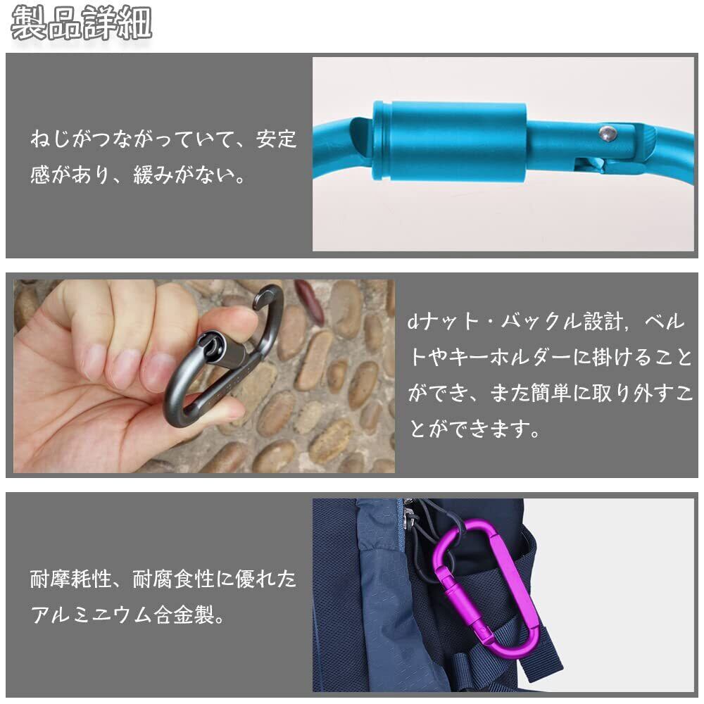 ハイキング/キャンプ/釣りなどのアウトドア活動中に、小さなバッグ、ボトル、小さなトーチをバックパックに掛けるために使用することができます。 また、日常のファッションアクセサリーとして、鍵や水筒、マグカップなどの小物を吊るすのにも大変便利です。[注意】カラビナは小さいので、大きいものや壊れやすいものをぶら下げないでください、登山や大きな安全器具にはお勧めしません。