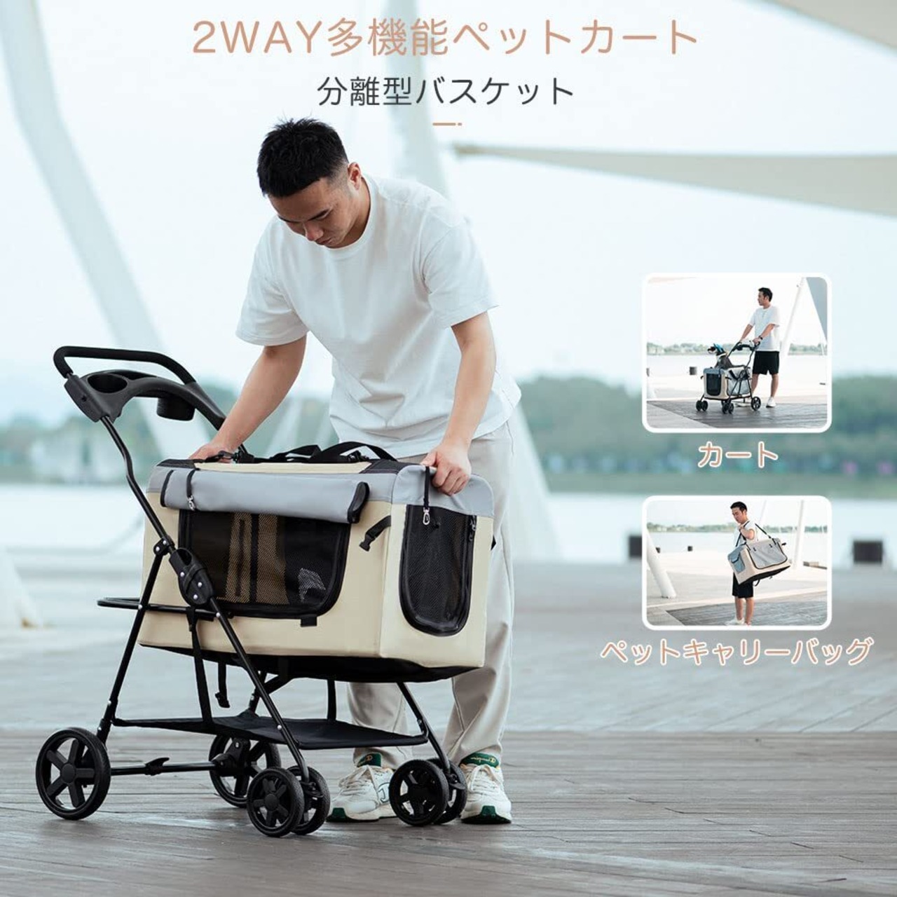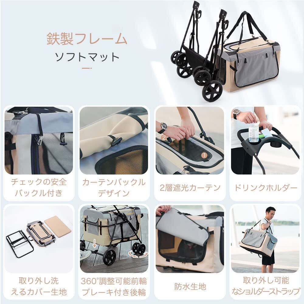 Pandaloli ペットカート 犬 バギー ベビーカー:中型犬 小型犬 猫 多頭 カート 4輪 軽量コンパクト 耐荷重25Kg 前輪360°回転 後輪ブレーキ付き 飛び出し防止リード2本付き 折りたたみ 組み立て簡単 ベージュ色