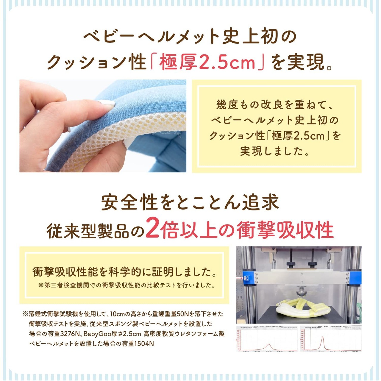 幾度もの改良を重ねて、ベビーヘルメット史上初のクッション性「極厚2.5cm」を実現しました。