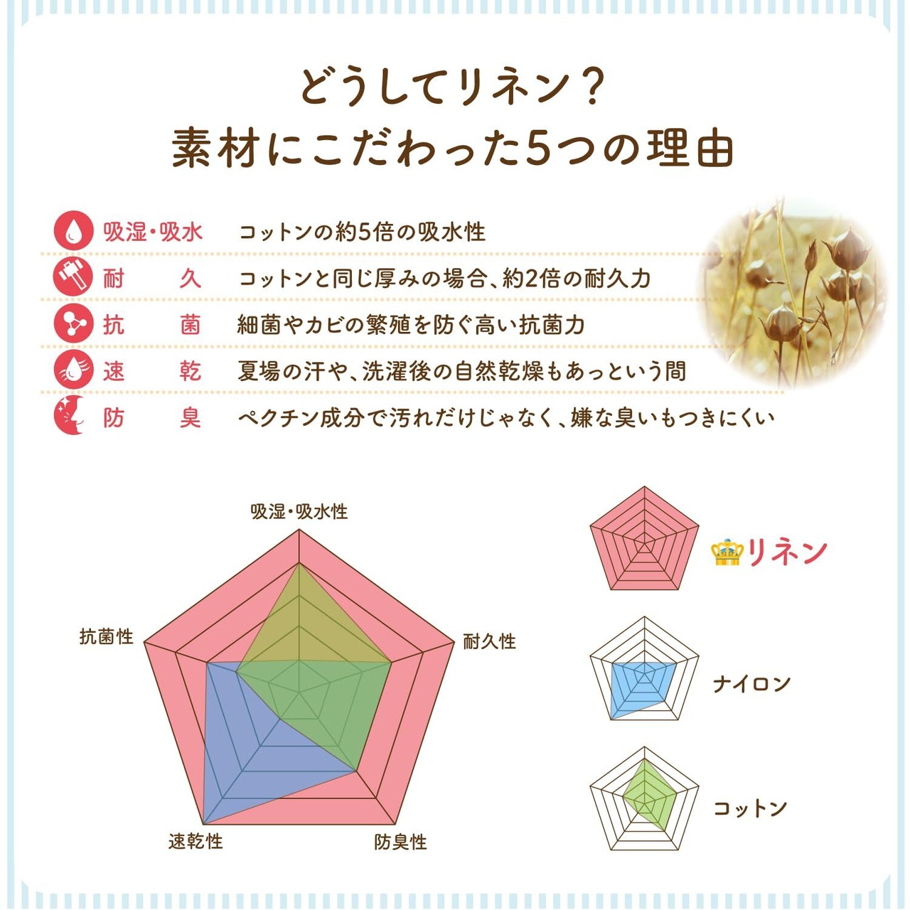 おしゃれでナチュラルな風合いであるだけでなく、機能性が抜群に優れたリネン(亜麻)素材を採用。 吸水性・速乾性・通気性・耐久性にすぐれた赤ちゃん用衣類に最も適した素材です。