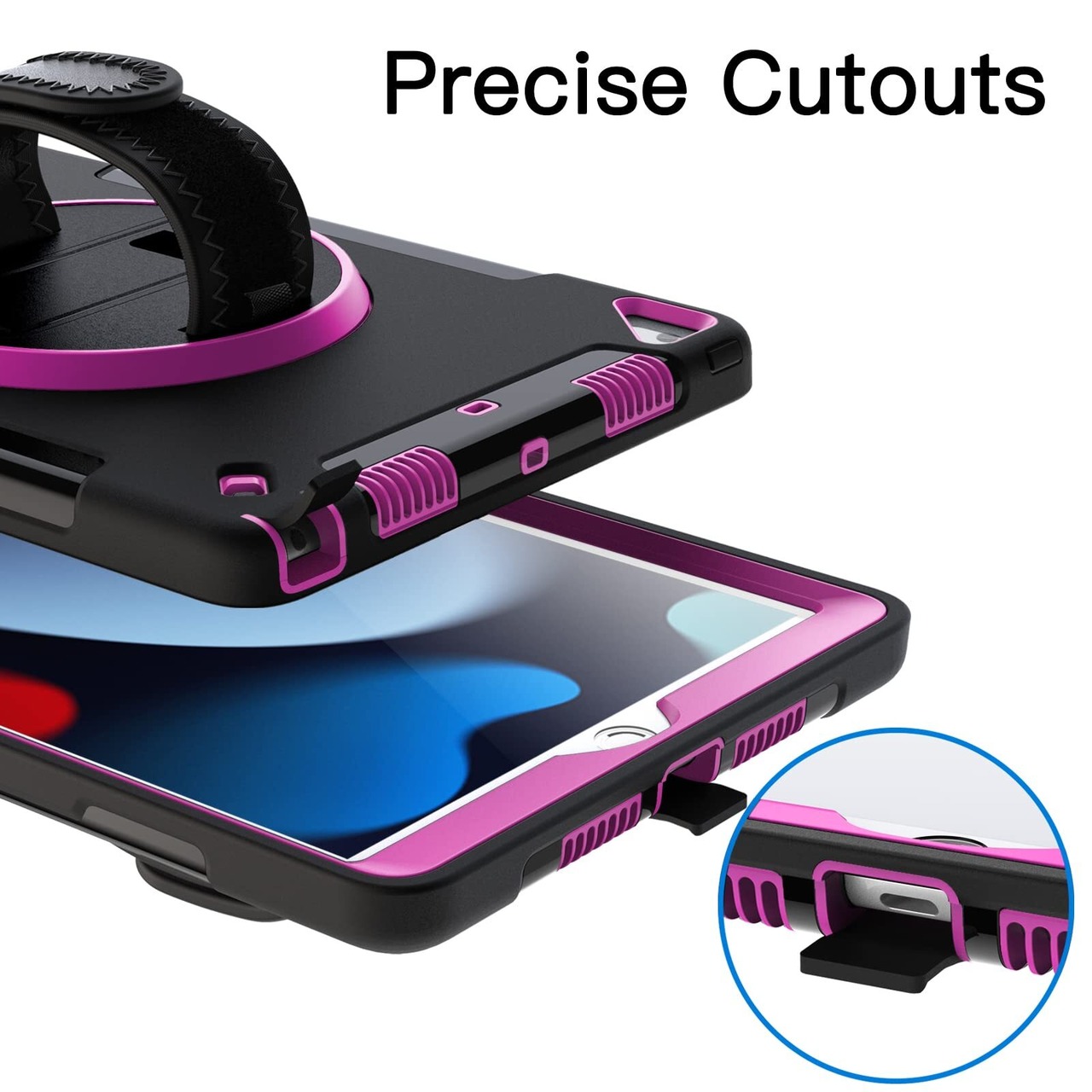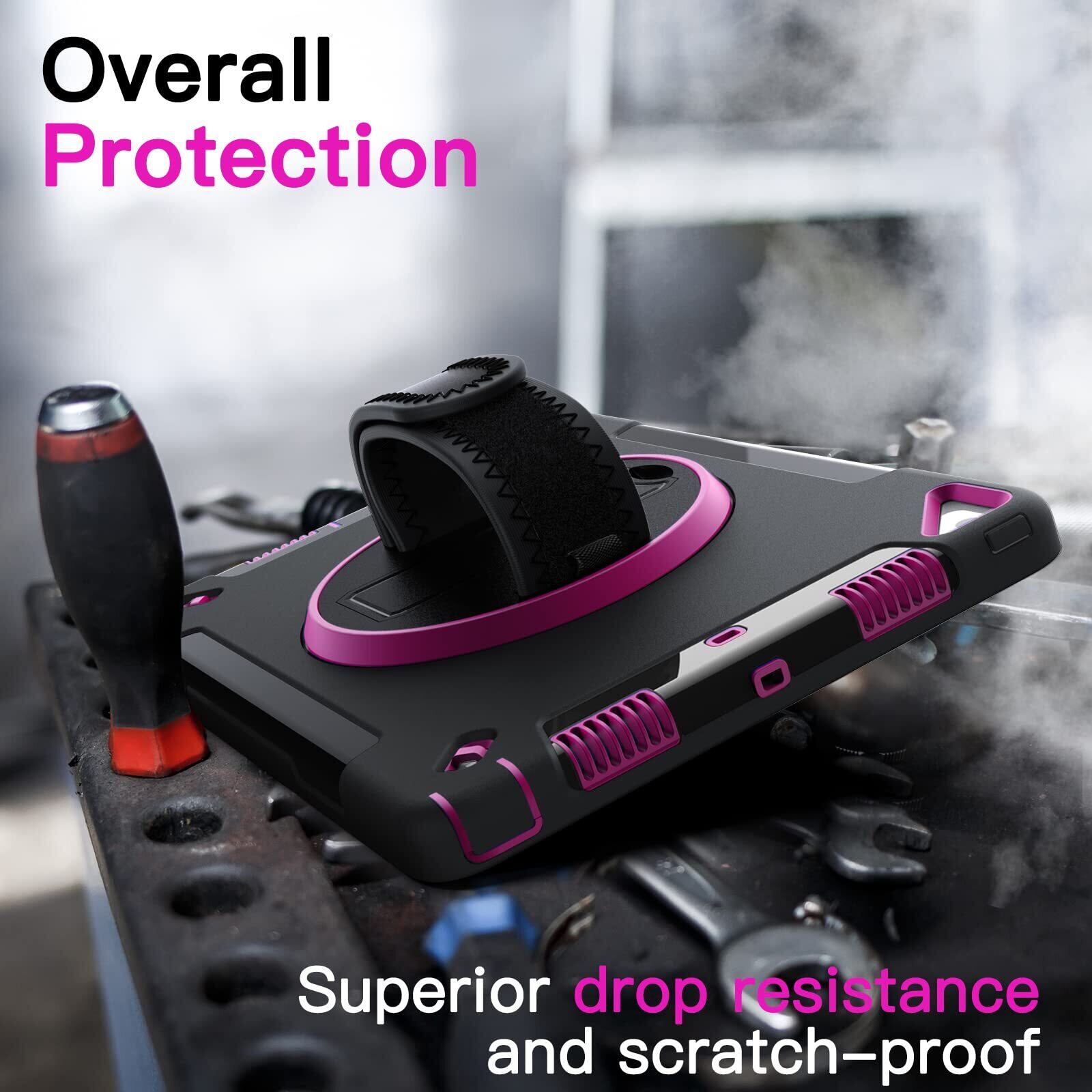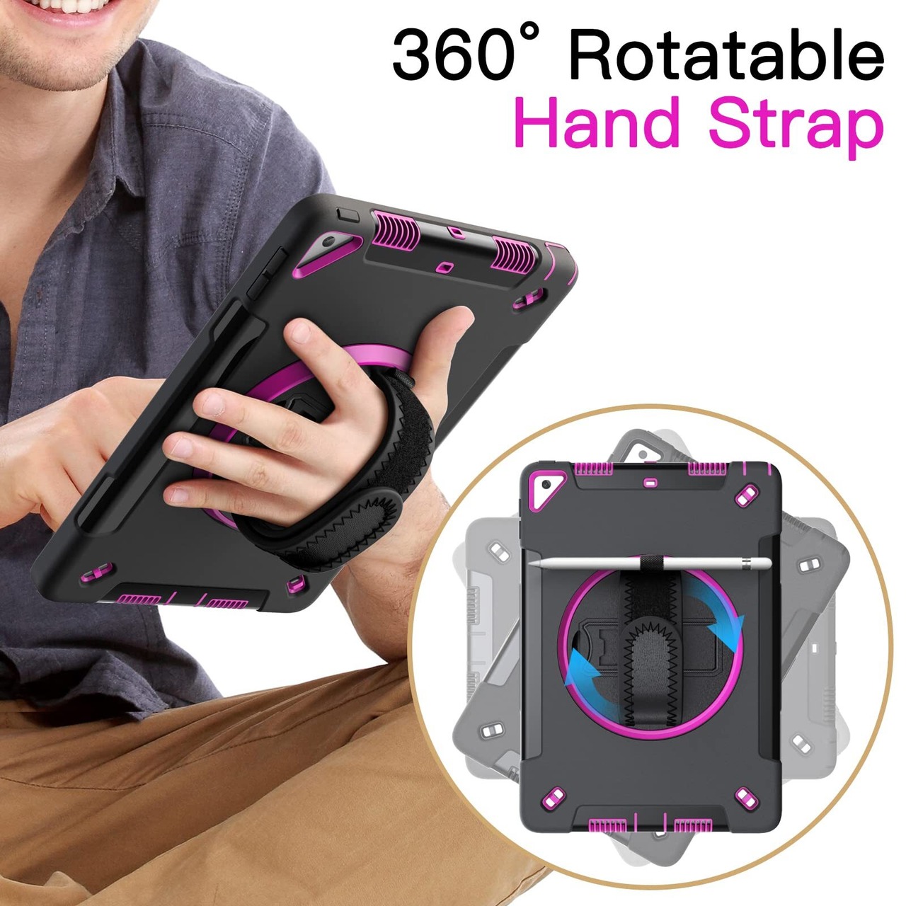 [360°回転キックスタンド & ハンドストラップ] 複数の角度でiPadを簡単にサポートします。さらに、柔らかいハンドストラップにより、iPad をしっかりと快適に保持し、偶発的な落下を防ぎます。お子様は iPaを簡単かつ安全に使って、勉強したり映画を見たりできます