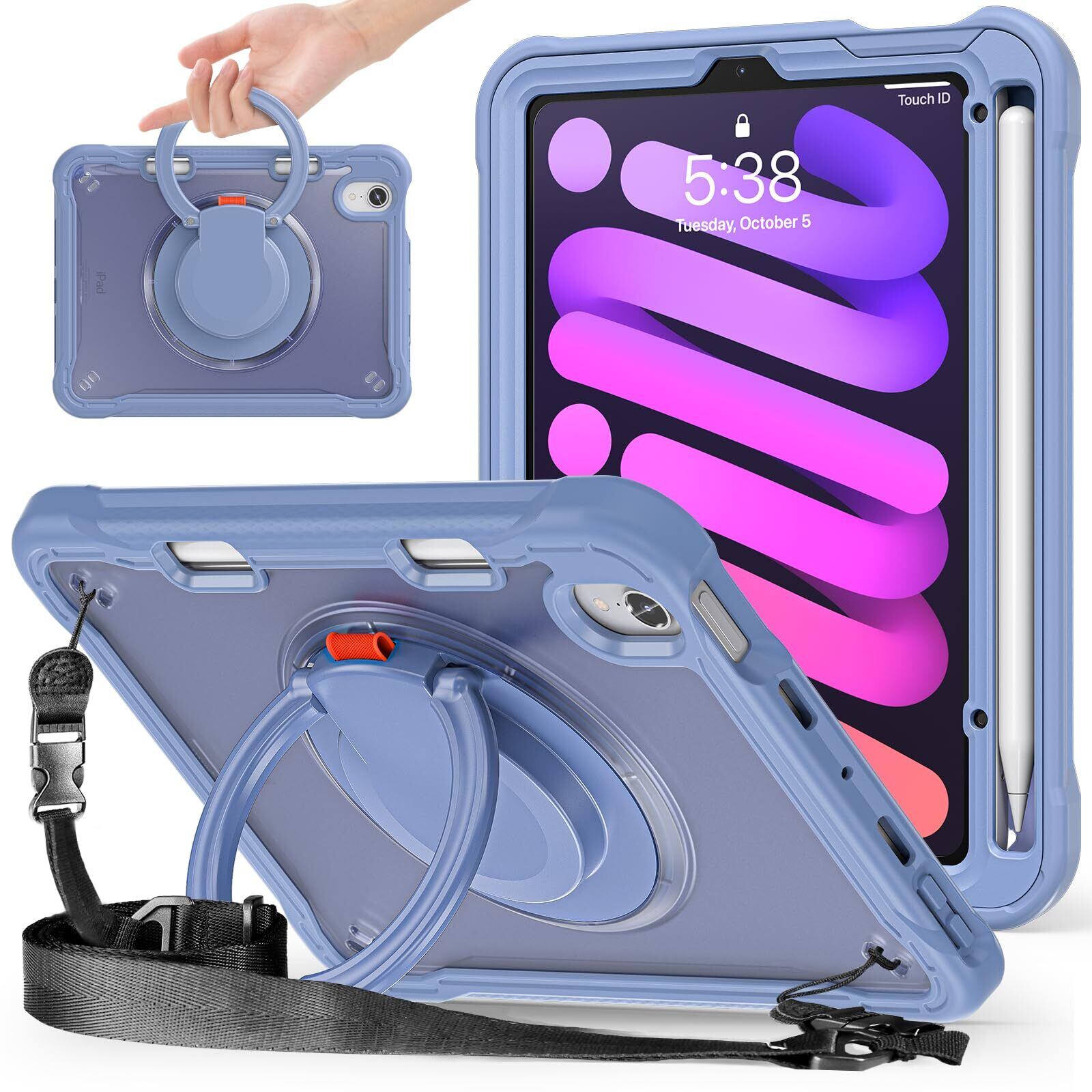 【新春セール】縦置き 横置き iPad Mini6 iPad Mini7 ケース 肩掛け 360°回転持ち手 ペン収納 iPad mini 第6世代 / iPad mini A17 Pro カバー ショルダーストラップ付き ハードPC +シリコン リングスタンド 耐衝撃 半透明 背面カバー つや消し (紫灰) | nico3588