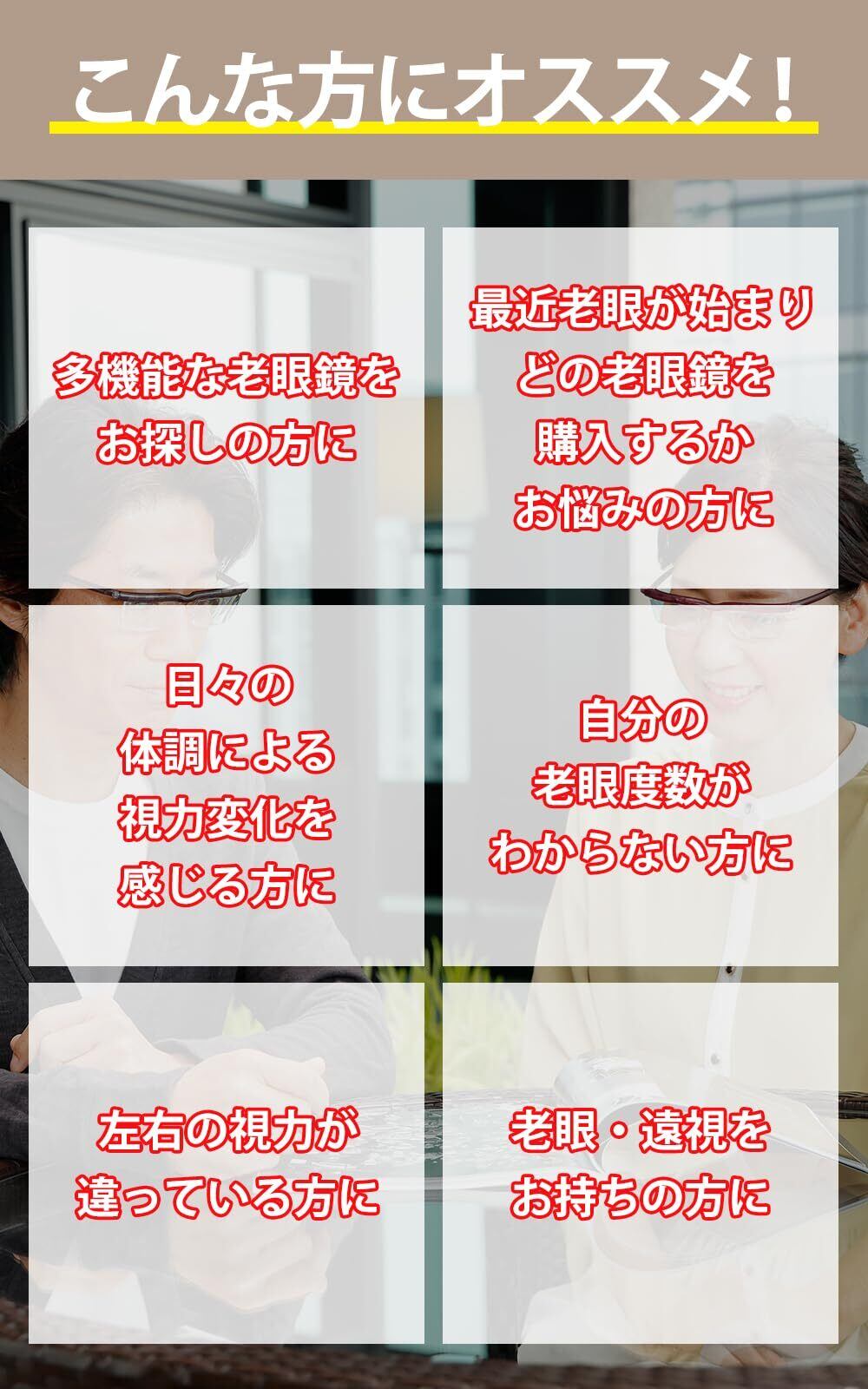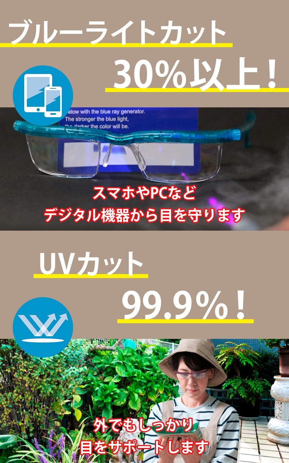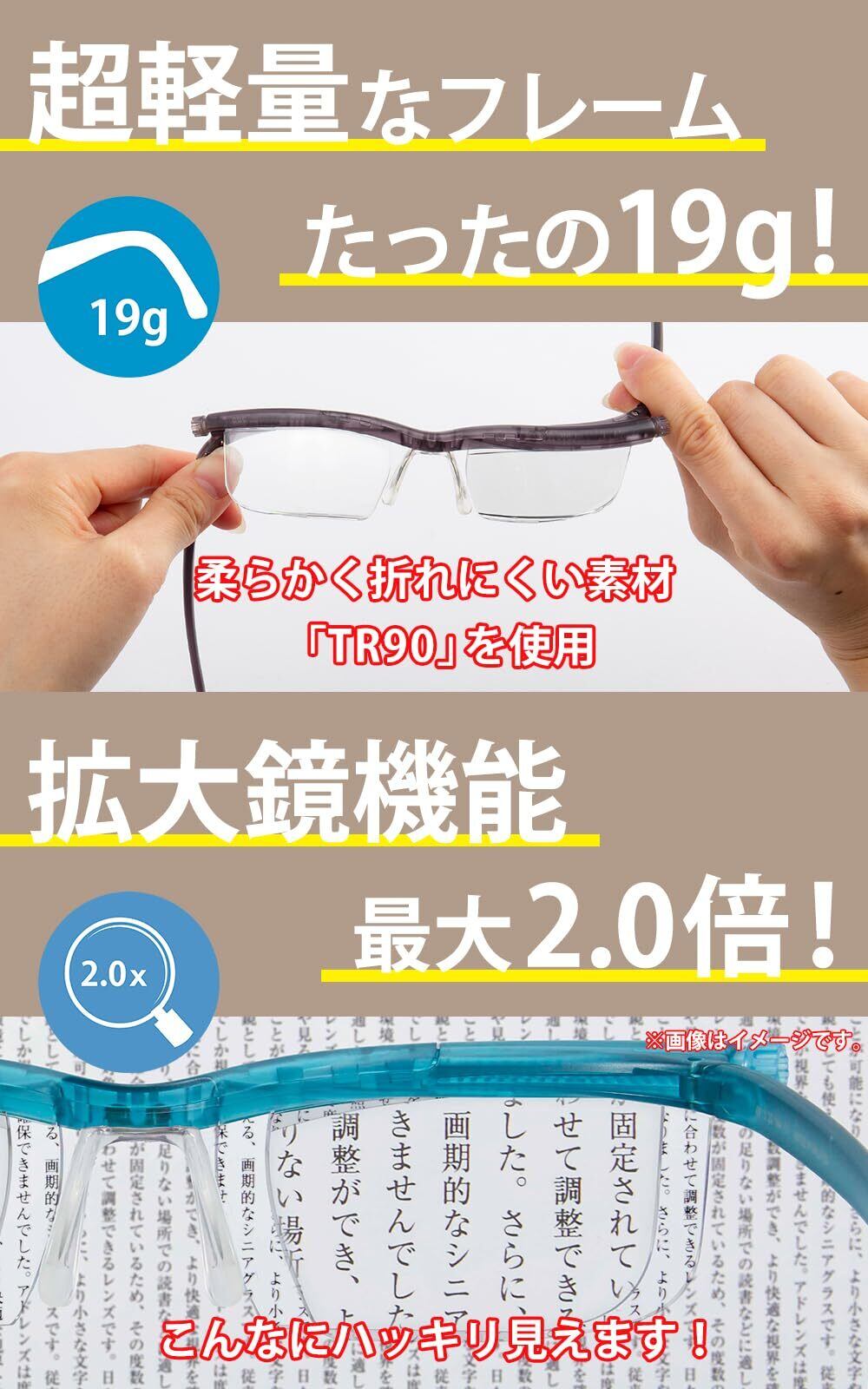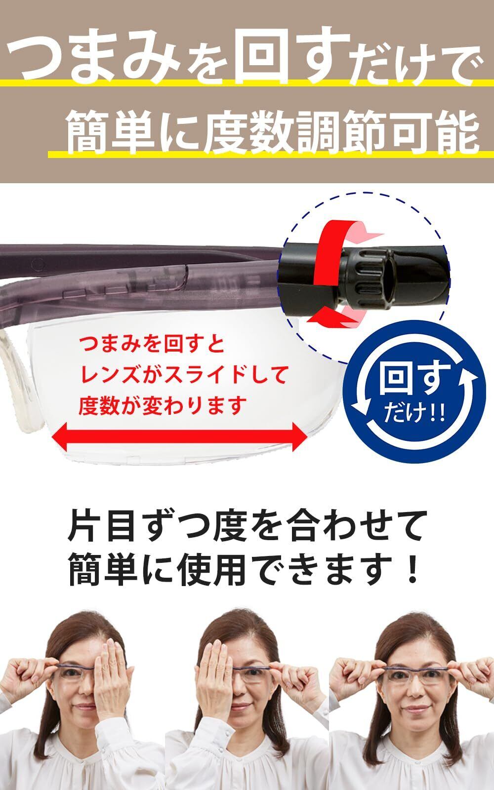 視力に合わせて+0.5D~+4.0Dまで度数を調節できるシニアグラスです。