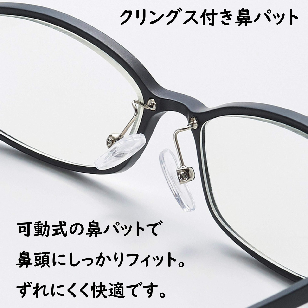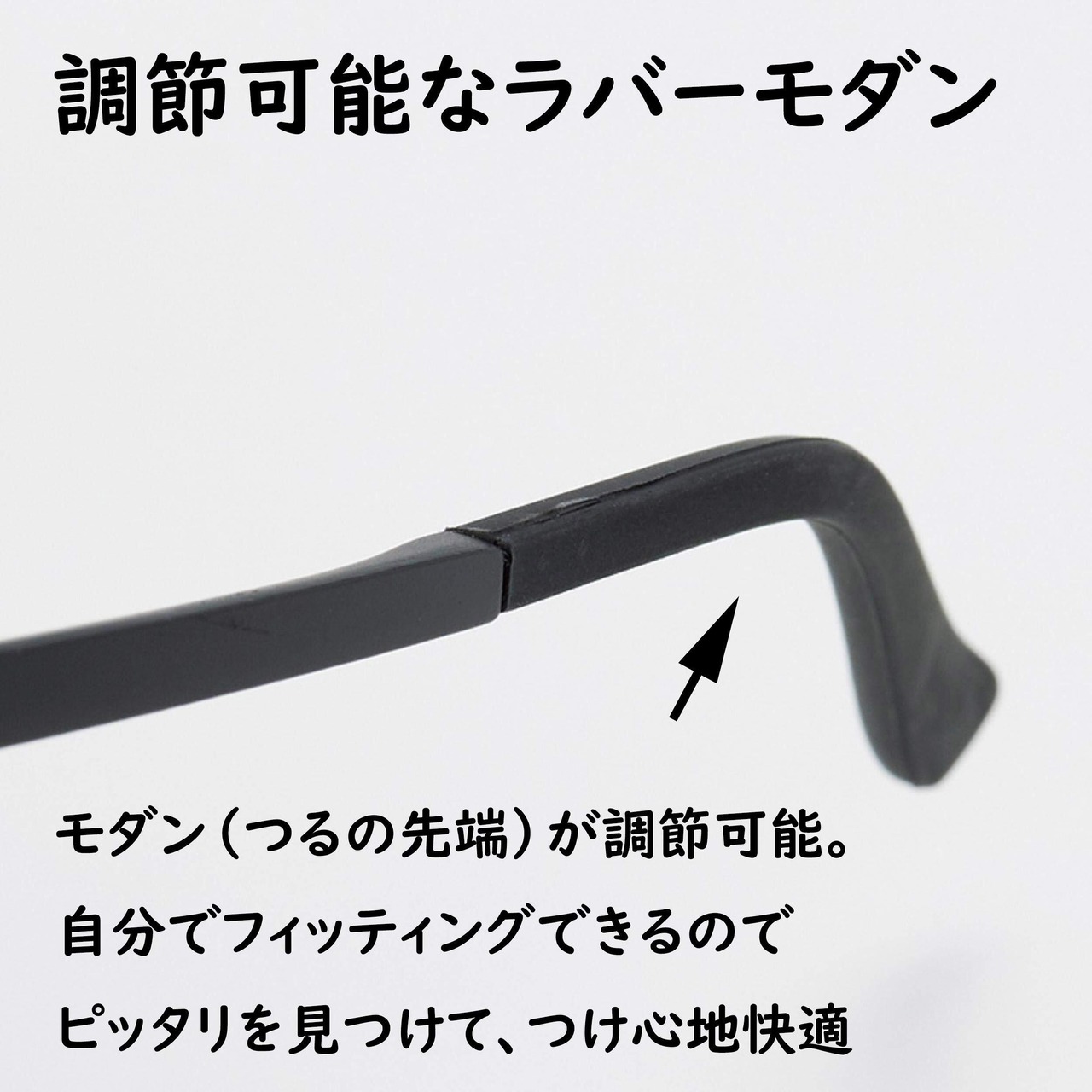 TR90フレームは、非常に弾性のあるバネのようなフレーム。さらに先端は調節可能なラバーエンド。稼働する鼻パット。だから、頭のサイズに合わせて 大きいサイズ の要望の多いメンズから、小顔で ずれてしまいやすい レディースまで、 疲れにく。 痛くなりにくい。ズレにくい。の三拍子。