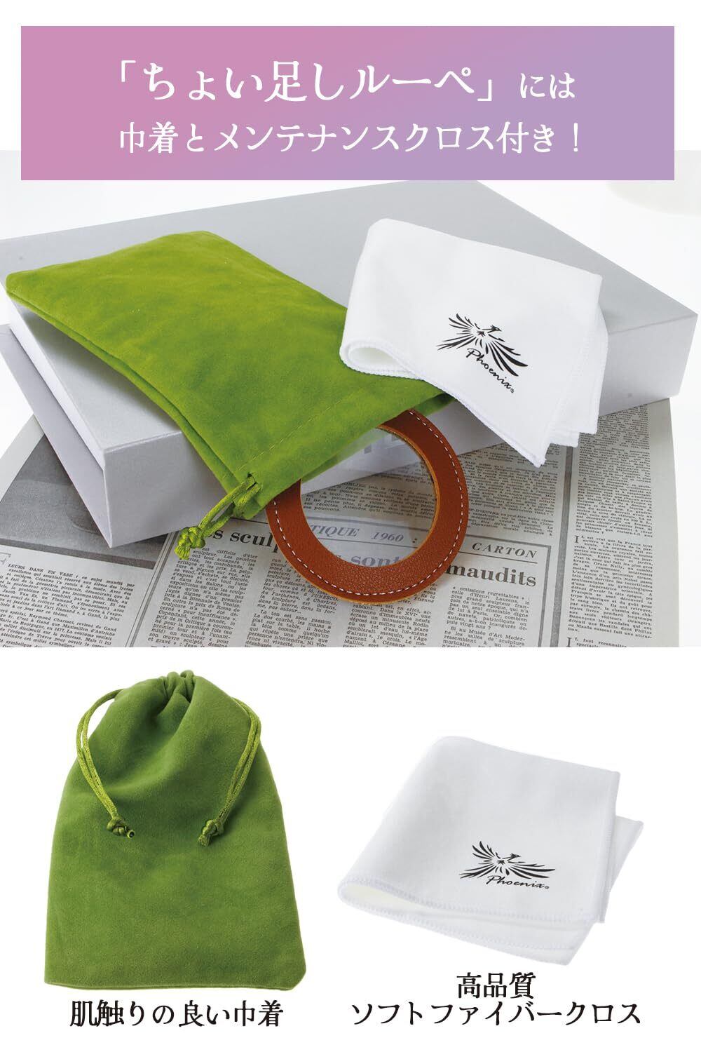 * 【うれしい2つの付属品付き】ネックレスルーペを収納できる巾着。滑らかな肌触りで厚みもありますので、ルーペを優しく保護します。また、レンズ拭き用高品質ソフトファイバークロスもお付けします。レンズについてしまった指紋や汚れなど柔らかなクロスで拭きとれます。