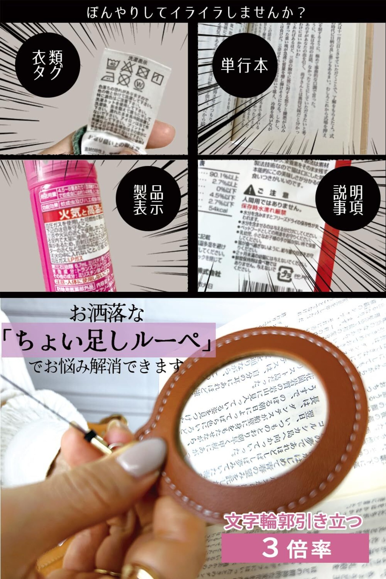 * 【こんな時に使ってみてください】お出かけ先でのメニュー表示や洋服のサイズ表、スーパーなどでの食品成分表、観劇の際、プログラムを見る場面など、お洒落に着こなしたお洋服に合わせてお使いいただけるデザインです。もちろんご自宅でも!