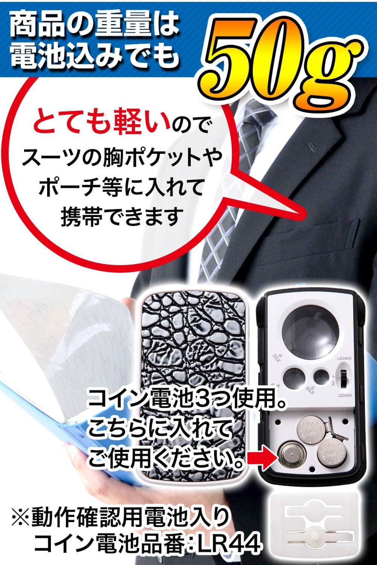 【LED/ブラックライト付き】便利で重宝する3つのライトを搭載!LEDライト・ブラックライト ライトはルーペを引き出すと自動で点灯します!影が減って細かいところまでハッキリ・クッキリ見える!そのうえおしゃれな2種類のデザイン(ブラック・シルバー)を展開しています。どちらのデザインも手触り心地よく使いやすいく、重量50gととても軽いのでスーツの胸ポケットやポーチ等に入れて携帯できます!