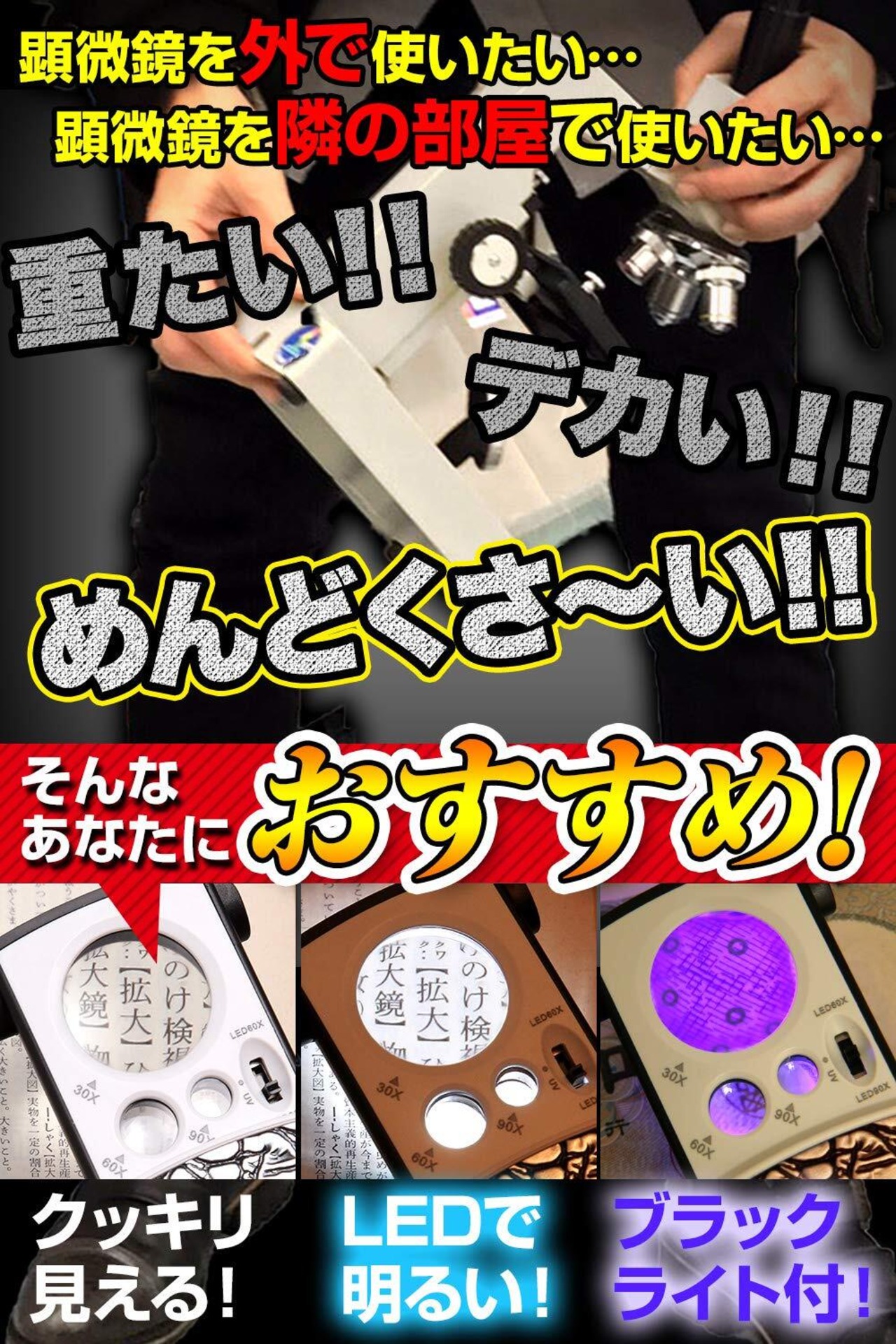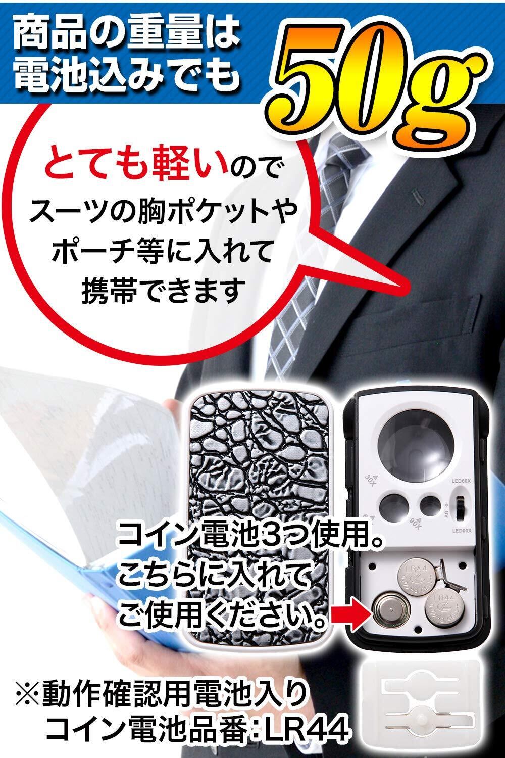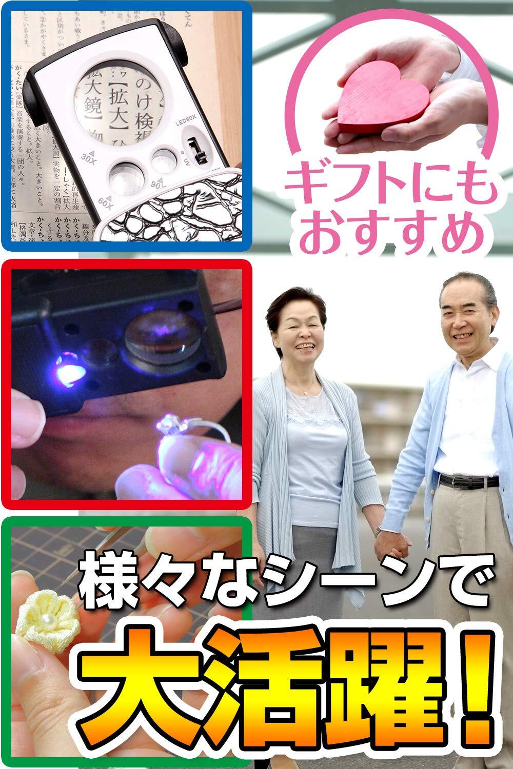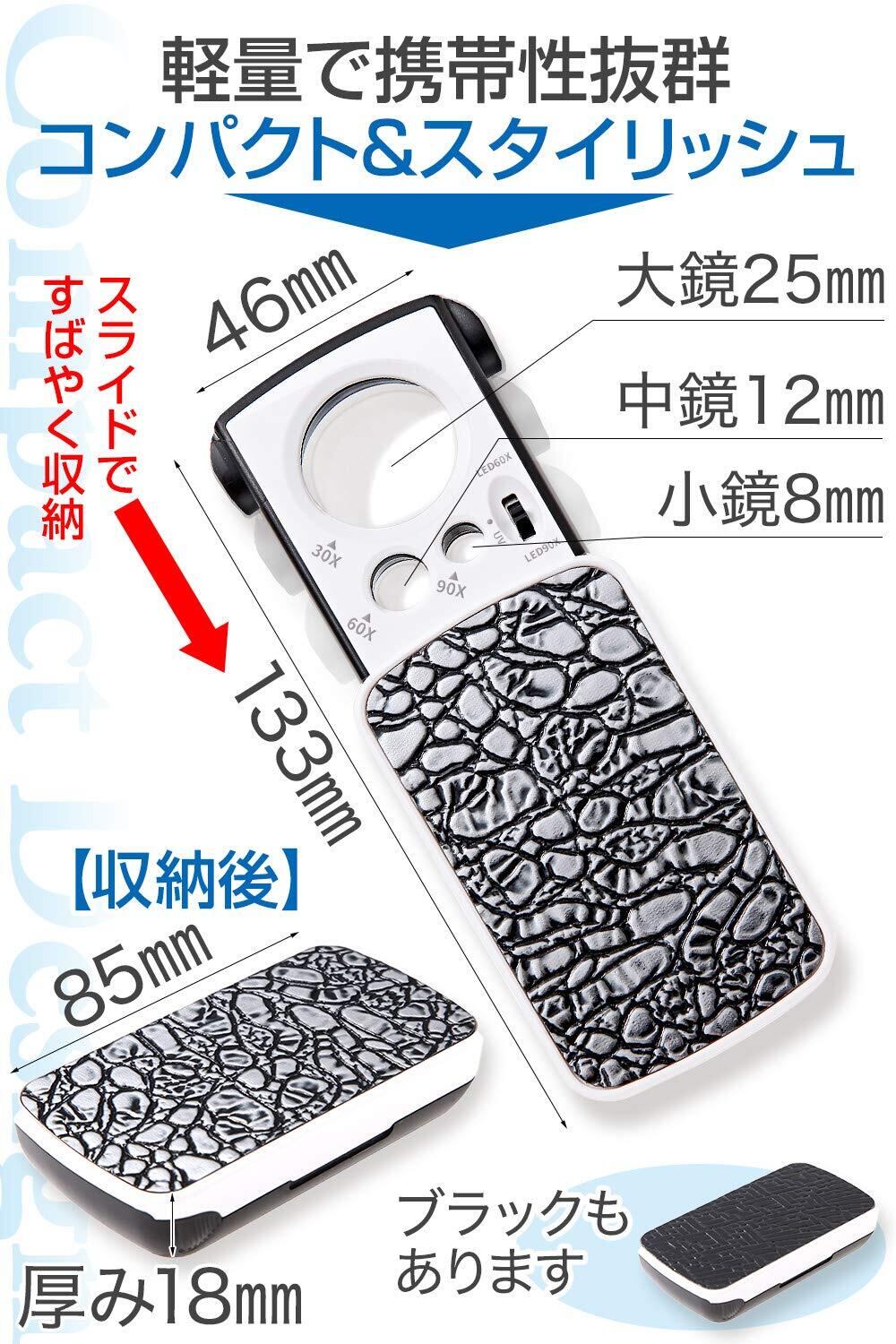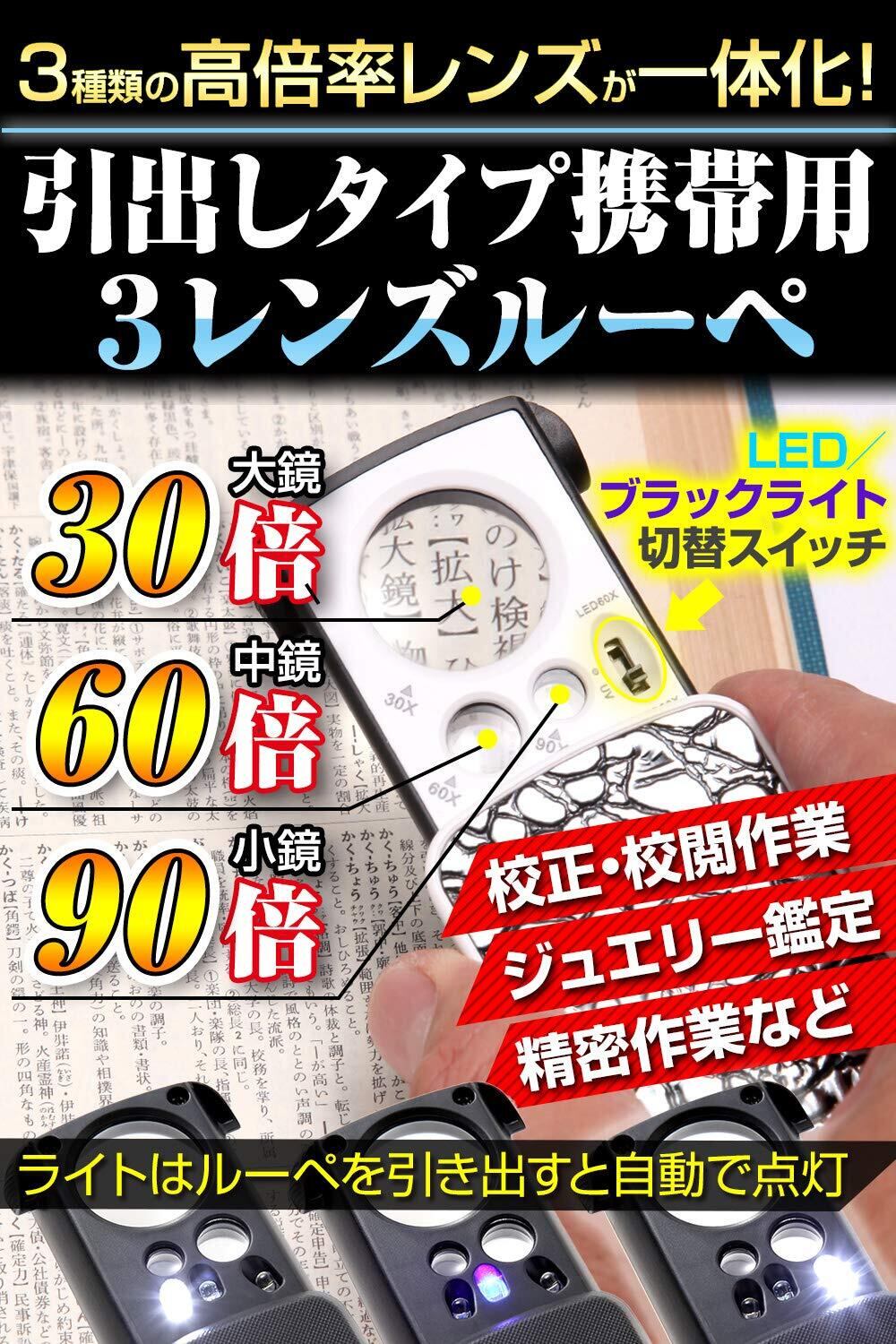 【3種類の高倍率レンズ一体化!】あなたは下記のような事を感じたことはありませんか?もっと細部まで細かく見たいのに見えない!職業柄、細かいものを見ることが多い。通常のルーペだと影になって暗くて見えづらい・・・そんな時に是非使っていただきたいルーペがこちらです!うれしい機能がいっぱい3種類の高倍率レンズが一体化!大鏡30倍!中鏡60倍!小鏡90倍!LED・ブラックライト搭載!ジュエリー鑑定、校正、校閲用、携帯ルーペ!