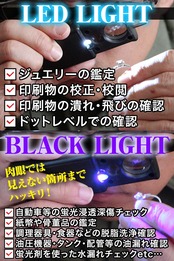 【精密作業に大活躍】様々な精密作業や日常生活、動植物の観察に大活躍!例えば指に刺さって痛いトゲ抜きからジュエリー鑑定、印刷物の校正、校閲、潰れ・飛びの確認など印刷物のドットレベルまで見えるルーペです!ブラックライトを使用すると右記のような使用が可能です。自動車等の蛍光浸透深傷、蛍光磁粉深傷、紙幣や骨董品の鑑定、外食産業・調理器具・食器などの脱脂洗浄確認、油圧機器・タンク・配管等の油漏れチェック、蛍光剤を使った水漏れチェックetc・・・肉眼では見えない箇所までハッキリと見えて作業もはかどります!
