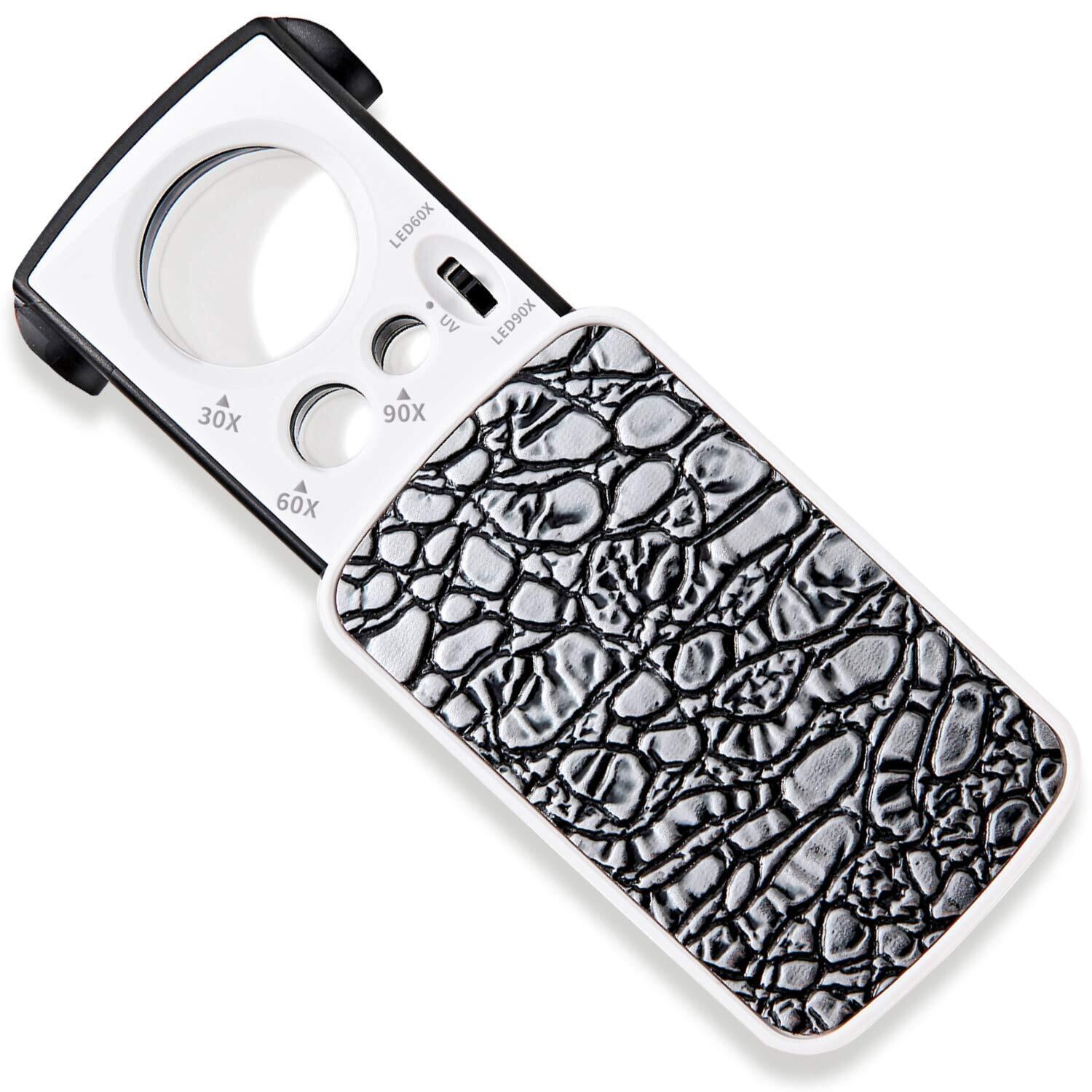PhoenixLoupe ジュエリー鑑定 校正・校閲用 携帯ルーペ【30倍&60倍&90倍】3種類レンズ/LEDライト/ブラックライト付き (シルバー)