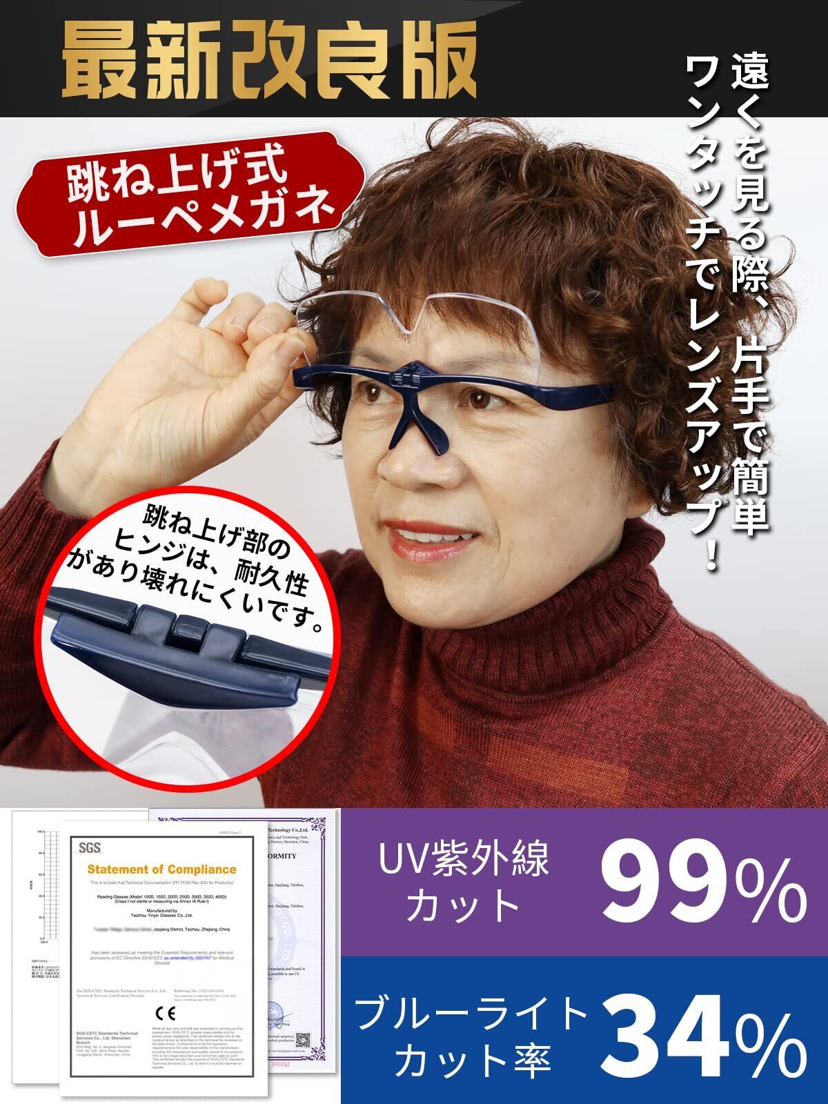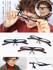 【跳ね上げ式&ブルーライト34%カット】片手で簡単ワンタッチでレンズアップ、遠くを見る際、かけ外しをすることなくストレスフリーでお使いいただける跳ね上げ式ループです。レンズは、UVカットレンズを使用しており、機能面も充実。「スマホやタブレット」対策として、大きく見える、タブレットやスマホなどのデスバイから有害な青色光をよく遮断して、長時間携帯またはタブレットを使う人のために設計されています。 テンプルが長く柔らかいので締め付け感が無く痛くなりにくい作りとなっています。枠なしレンズで広い視界を确保出来ます。跳ね上げ部のヒンジは、耐久性があり壊れにくいです。