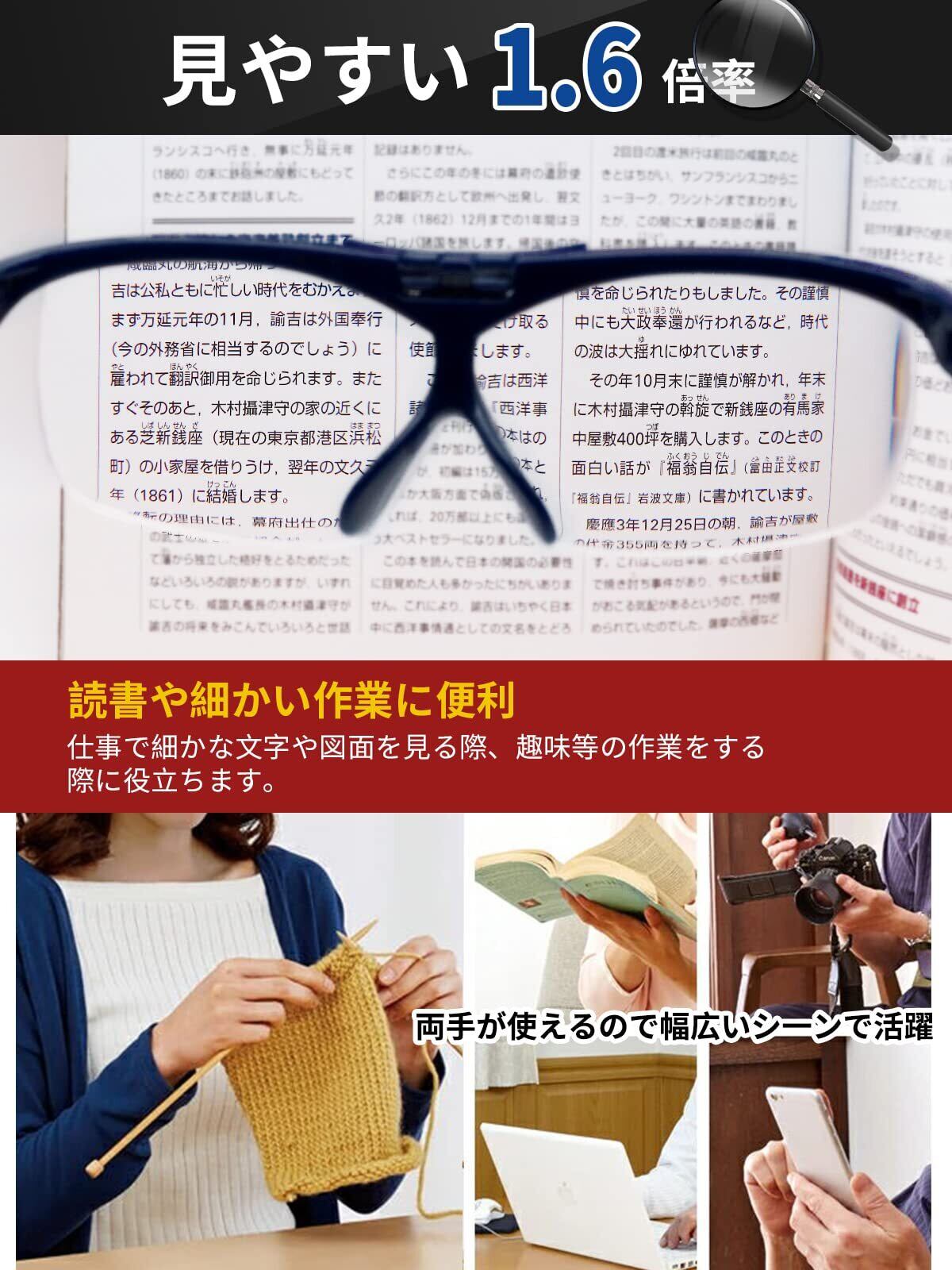 【読書や細かい作業に便利】視野も広くすぐ眼鏡の上からかけて使える、フロント跳ね上げ式なので、面倒なかけ外しの手間がなく集中して作業ができます。仕事で細かな文字や図面を見る際、趣味等の作業をする際に役立ちます。読書・ネイルケア プラモデル ルアー作り バイク修理 手芸 裁縫 車修理など細かい作業・スマートフォンの細かい文字を読むなど日常の様々な用途にお使いいただけます。母の日、父の日、敬老の日などの贈り物に高齢者の方もスマートフォンやタブレットを使う時代なのでこの拡大鏡めがねをプレゼントすると大変喜ばれます。