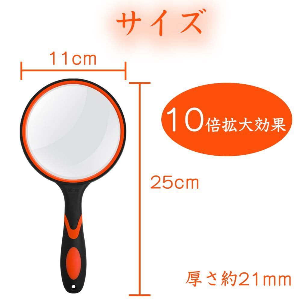 手持ちルーペ ビッグルーペ 拡大鏡 虫眼鏡 レンズ径100mm 高倍率タイプ 10倍拡大 手持ち読書拡大鏡 携帯便利 見やすい 高齢者及び専門家使用可能 趣味観察/新聞/読書/地図/科学教室に使用 (オレンジ)
