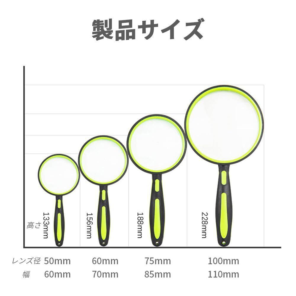 1.【操作が簡単、4サイズ】拡大鏡は電池が必要なく、操作が簡単。 製品の色:イエロー 商品サイズ約: ❶縦133 mm・幅60 mm・レンズ直径50mm●重量45g、10倍拡大❷縦156 mm・幅70mm・レンズ直径60mm●重量63g、8倍拡大 ❸縦188mm・幅85mm・レンズ直径75mm●重量120g、6倍拡大 ❹縦228 mm・幅110 mm・レンズ直径100mm●重量208g、5倍拡大。 2.【10倍拡大】我々の10 x大きなハンドヘルド拡大鏡は本、新聞、雑誌、地図と観察昆虫、植物、宝石、コイン、工芸品の細部を見るのに最適です。自然探検、科学観察、趣味の上で子供のためにより多くの楽しみを持ってきて、老人に本を読んで、小さな印刷をラベルにしてください。 3.【アンチスリップデザイン】この拡大鏡はゴムの滑り止めと長いハンドルで設計されています。十分な長いハンドルは、あなたのために快適な経験を提供することができます。 4.【読書や細かな作業に最適】非常用にも裁縫にも!ネイル・アクセサリー・読書・新聞・読書・地図・設計図・プラモデル・模型製作・工作・手芸・彫刻etc・・・研究・検査にも辞書など活躍します! 5.【包装とアフターサービス】この商品は慎重にあなたの手に包装されている場合は、問題があったら、すぐに私たちに連絡してください、高品質のアフターサービスを持っています、ご来場ありがとうございました。